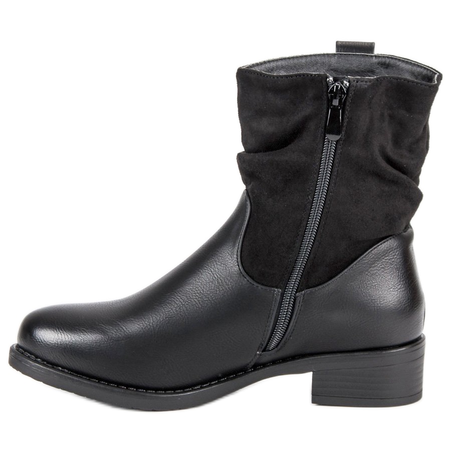 Descubra botas pretas exclusivas que se tornarão um elemento insubstituível no guarda-roupa de toda mulher. Estes sapatos elegantes são a combinação perfeita de estilo clássico e toques de rock que estão na moda hoje em dia. Confeccionados com excepcional atenção aos detalhes, caracterizam-se por uma interessante combinação de materiais - um cabedal em camurça ecológica em diferentes tons de preto entrelaçado com elegante couro ecológico, o que lhes confere um caráter único.