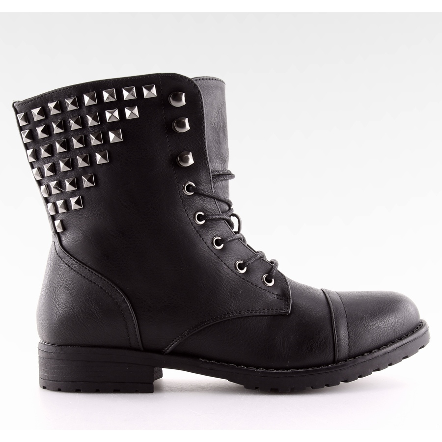 Botas de trabalho pretas S170 - personagem do rock em versão feminina. Botins de amarrar na cor preta clássica com detalhes fortes: tachas decorativas na parte de trás da parte superior e uma sola maciça com protetor conferem-lhes um estilo predatório e ao mesmo tempo universal. Graças à cor preta, você pode combiná-los facilmente com estilos do dia a dia e da noite, e o delicado pelo interno proporciona conforto e calor adicionais nos dias mais frios.