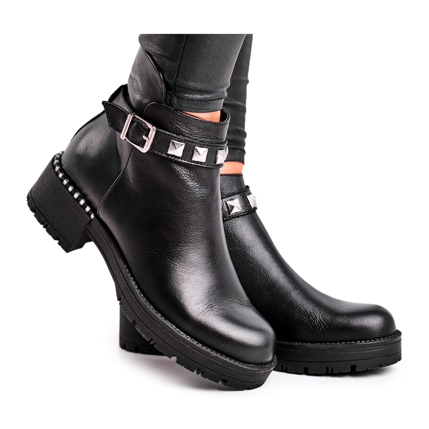 O seu interior foi cuidadosamente isolado com feltro, o que os torna perfeitos para os dias mais frios. Graças ao salto plano e ao zíper conveniente, você pode calçá-los facilmente, mesmo com pressa. Um cinto decorativo com fivela e strass confere-lhes um carácter moderno e fashion, fazendo com que se destaquem em qualquer estilo.