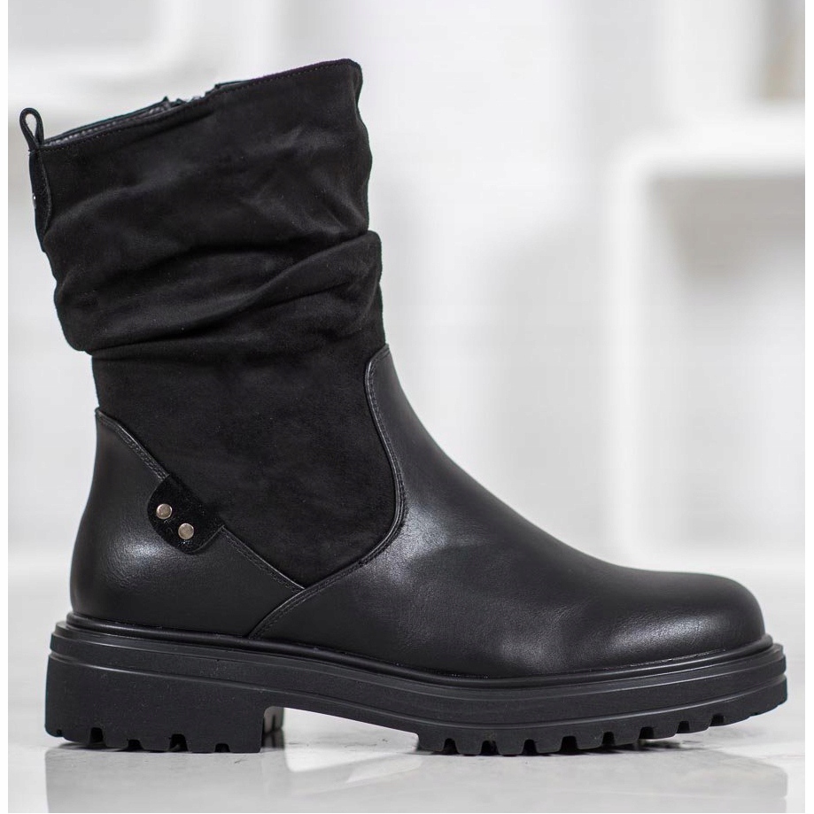 Descubra a elegância e o conforto oferecidos pelas quentes botas plataforma SHELOVET na cor preta profunda. Estes calçados femininos exclusivos até o tornozelo combinam perfeitamente o estilo casual com um charme único. Confeccionadas em couro ecológico e imitação de camurça, as botas além de ficarem na moda, são ecologicamente corretas.