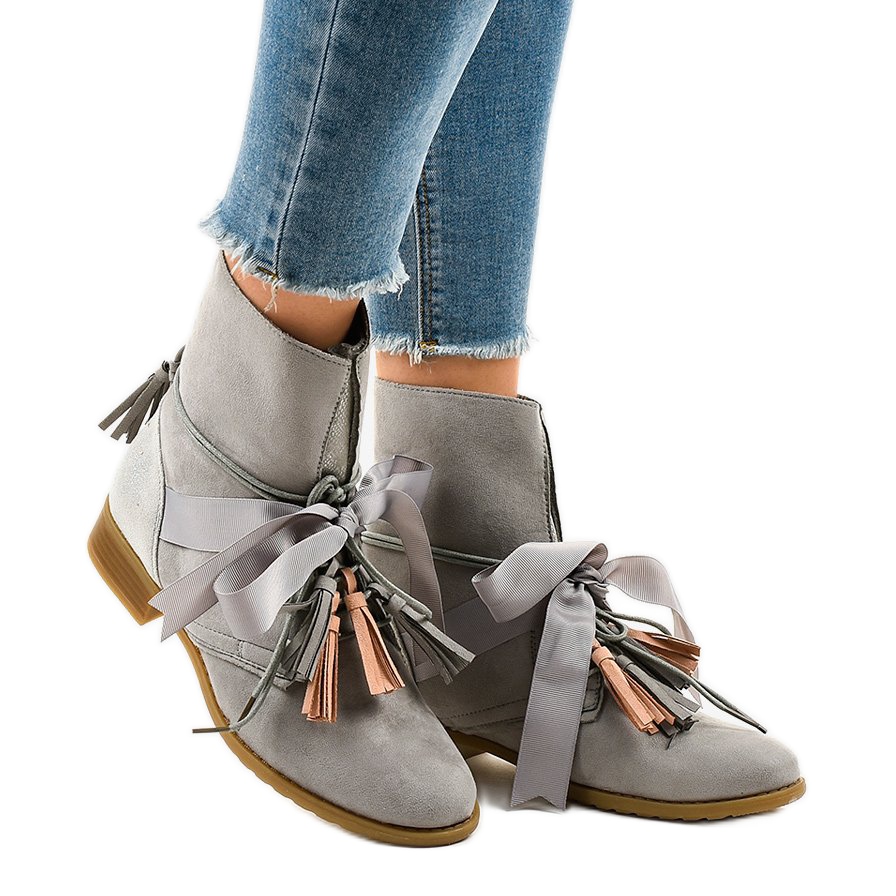 Detalhes: Botas rasas cinza amarradas com franjas A-226
