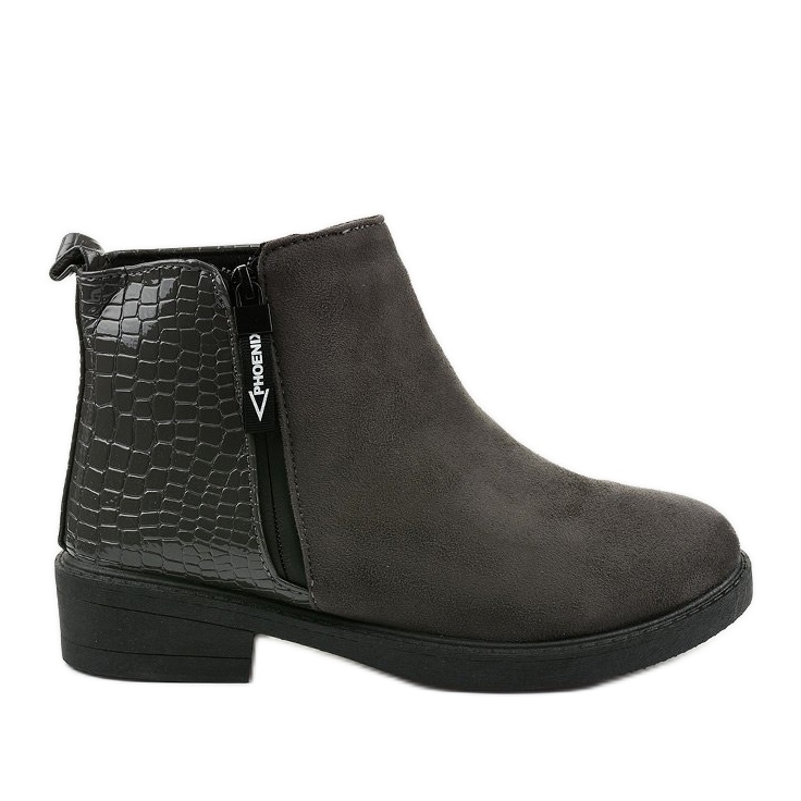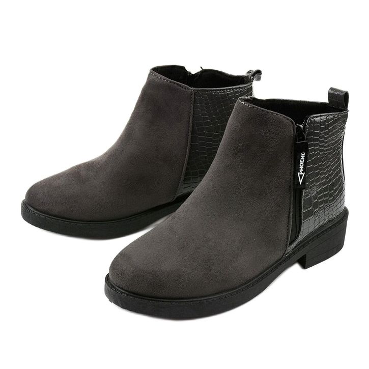 As botas rasas Genesario em camurça cinza são a escolha perfeita para mulheres que valorizam elegância e conforto. Feitos em couro camurça ecológico, esses botins combinam design moderno com durabilidade. A parte traseira e as laterais da parte superior são decoradas com couro ecológico envernizado com sutil relevo de cobra, o que adiciona um caráter único.