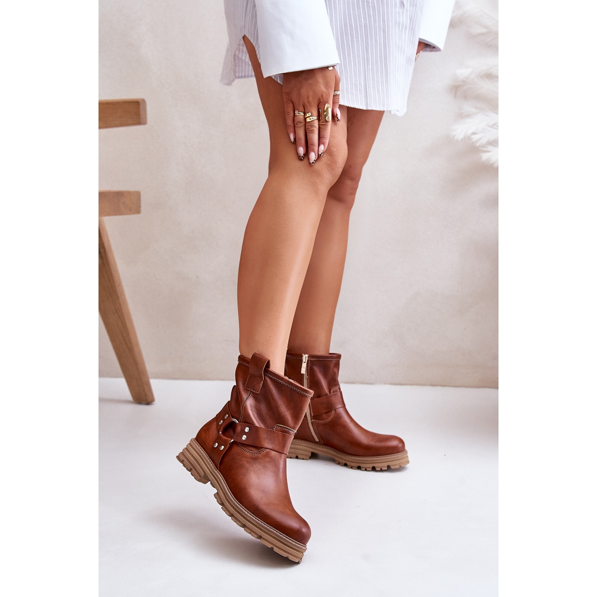 Seu design minimalista com dedos arredondados dá sutileza e um salto liso confortável e liso com uma altura de 4 cm garante estabilidade e conforto de usar o dia todo. As botas têm um fixador de zíper prático, o que facilita a instalação e a decolagem. Além disso, a parte superior é decorada com uma combinação espetacular de tiras com strass, que enfatiza seu caráter único e os torna um complemento ideal para as estilizações da moda.