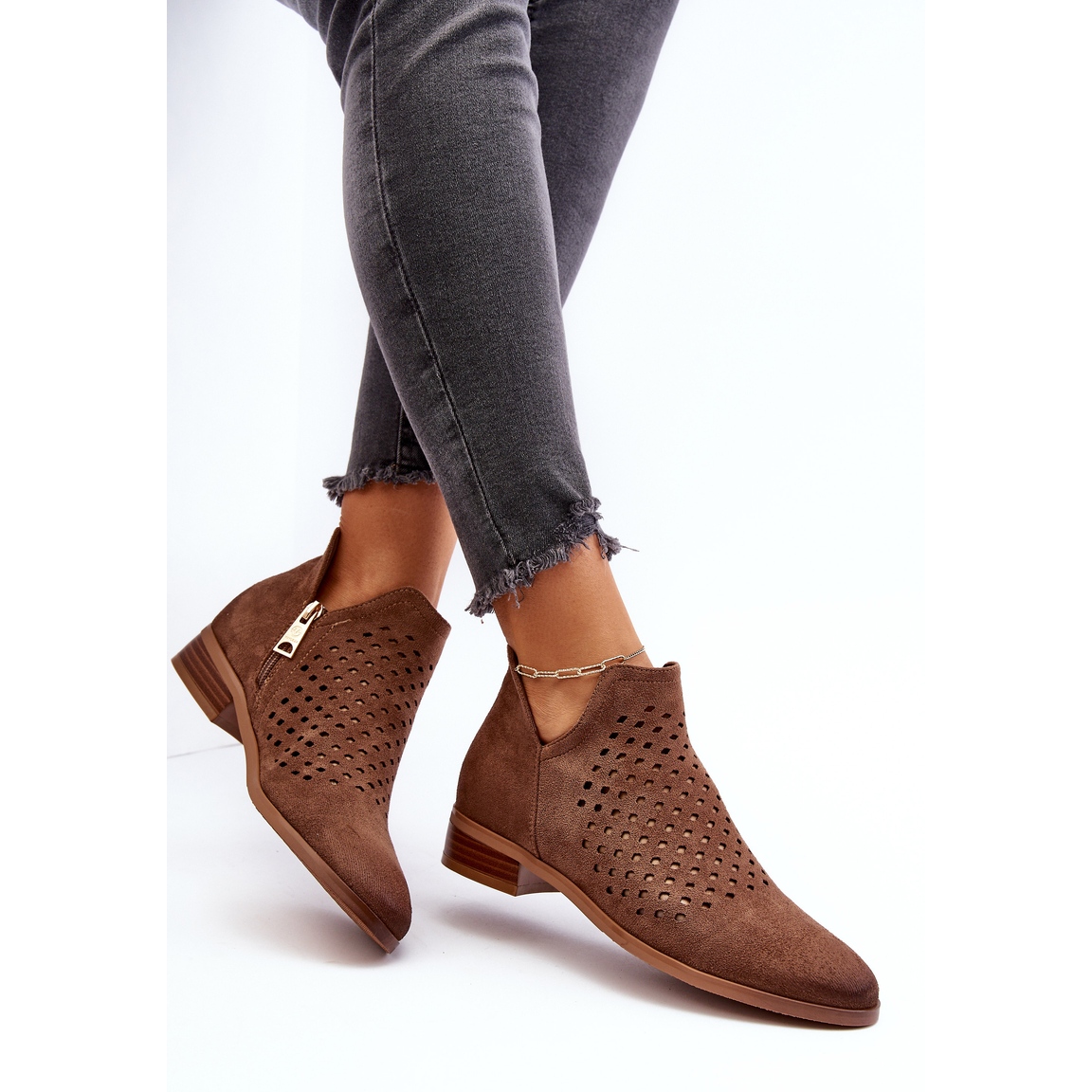 Descubra as exclusivas botas baixas femininas Janetris da Vinceza, que serão um complemento perfeito para o seu guarda-roupa para qualquer ocasião. Estas botas, confeccionadas em camurça ecológica de alta qualidade, cativam pelo seu design vazado, que confere um toque sutil e elegante ao estilo. A sua cor castanha torna-os fáceis de combinar com uma variedade de looks - desde os mais quotidianos até aos mais formais.