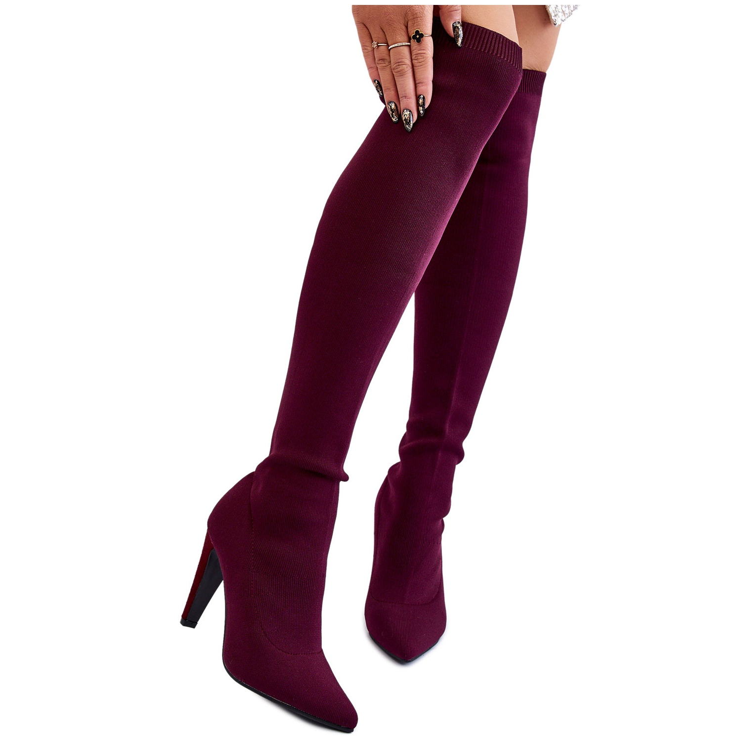 Descubra extraordinária elegância e conforto com as botas BM de salto alto com meias bordô. Estas botas altas acima do joelho são a escolha perfeita para mulheres que desejam combinar um look moderno com o conforto do dia a dia. Fabricados em material têxtil flexível, adaptam-se perfeitamente à largura da perna e o cordão superior permite um ajuste perfeito.