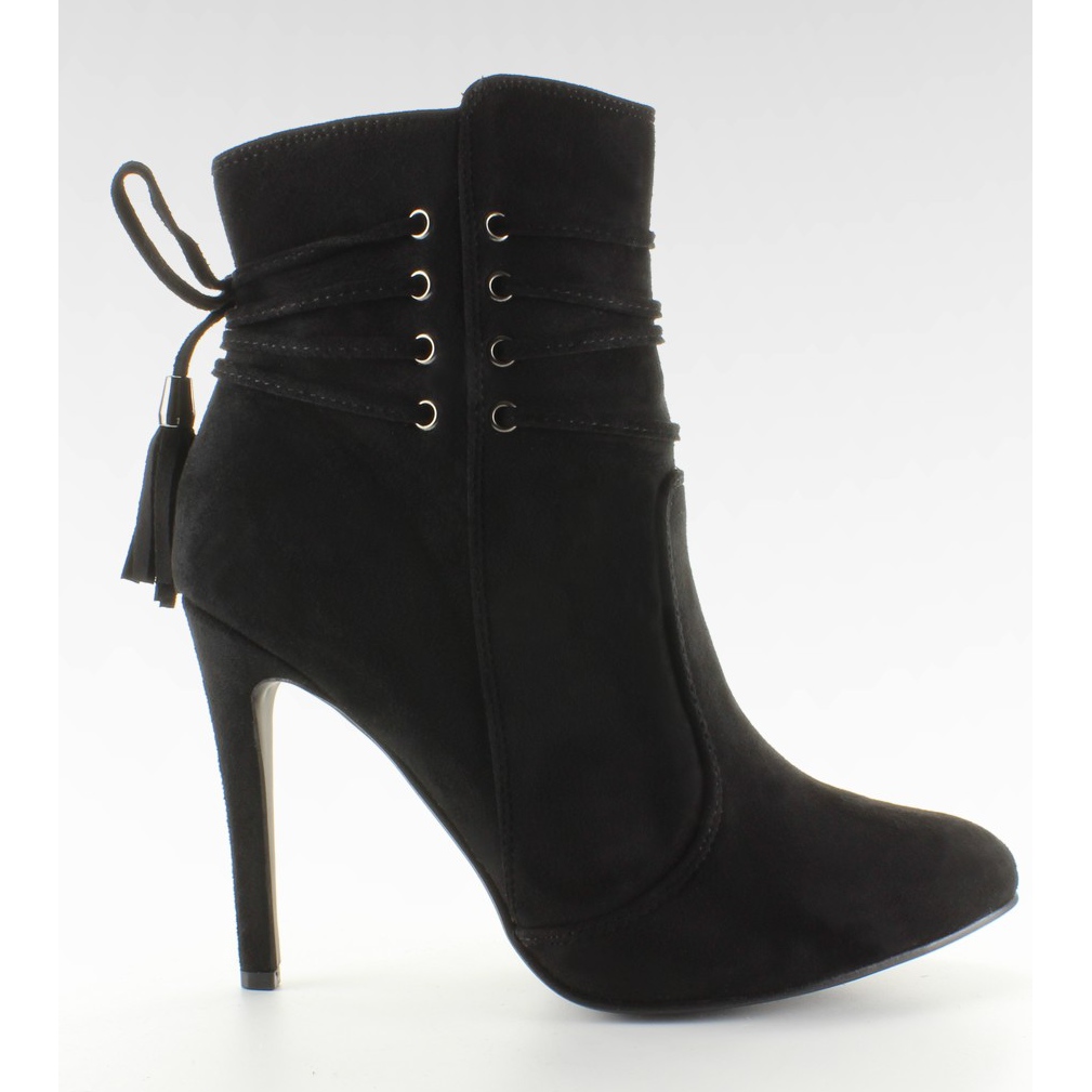 Botins de salto alto 4074 Preto - sensuais, elegantes e práticos. Botas clássicas pretas confeccionadas em camurça ecológica, com isolamento de pele delicada, perfeitas para os dias mais frios. Um estilete de 10 cm de altura emagrece a figura e cordões sutis com franjas ao redor do tornozelo adicionam um toque de estilo. Possui zíper na parte interna que facilita a colocação rápida.