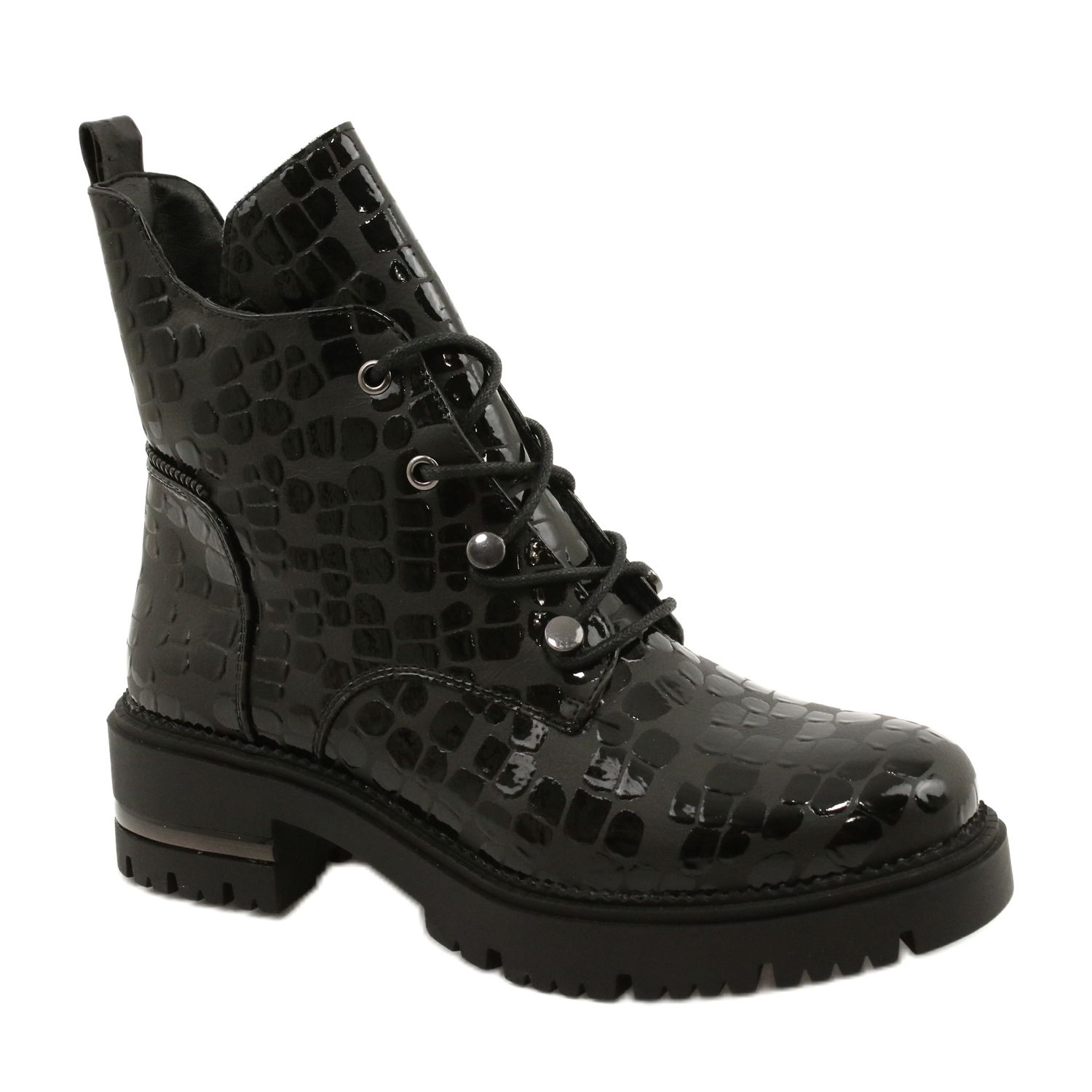 As botas elegantes Sergio Leone TR744 combinam clássicos com um sotaque moderno. Feito de couro ecológico estampado e envernizado, eles atraem looks com um padrão geométrico, e o acabamento brilhante lhes dá estilo. O interior e a inserção são isolados com pêlo macio (material: tecido), graças ao qual os sapatos são perfeitos para dias mais frios.