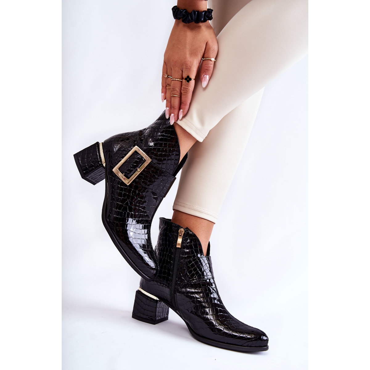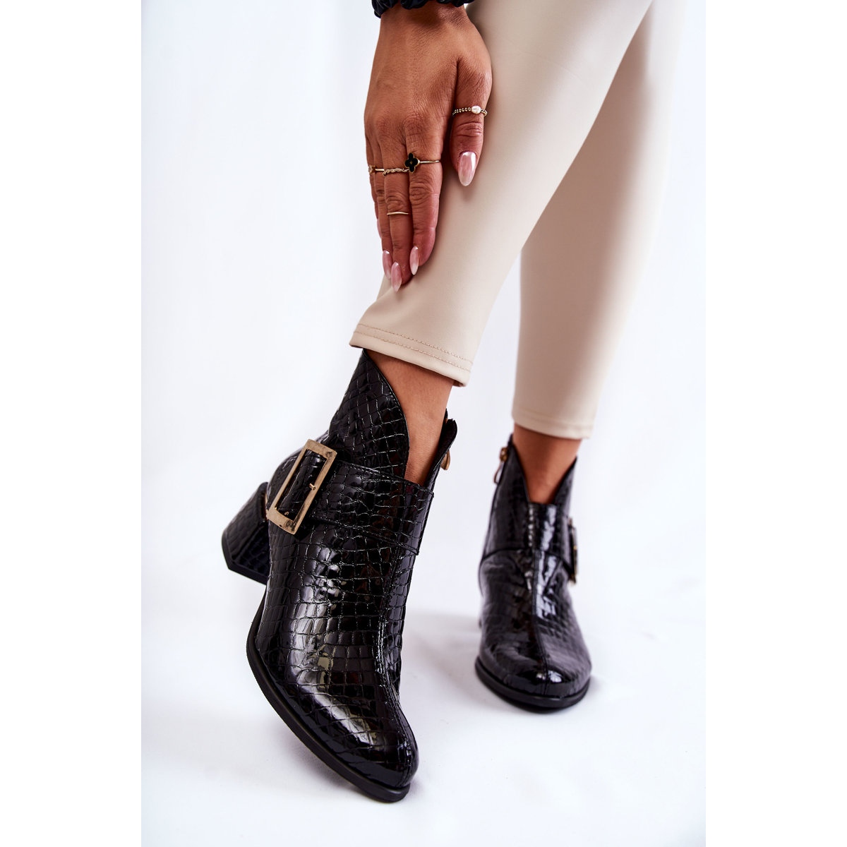 Detalhes: PA2 Botinhas de couro crocodilo com zíper preto Briana
