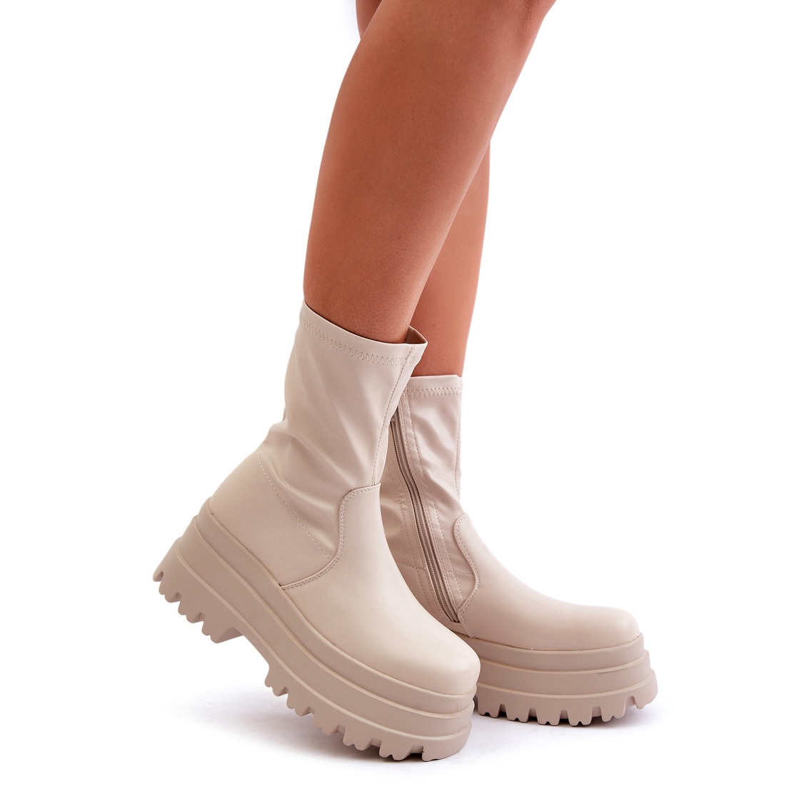 O fixador de zip facilita a instalação e a remoção de sapatos, e a elegante cor bege os torna perfeitamente misturados com várias estilizações. A plataforma superior alta e 6 cm de altura adiciona leveza à figura, e a largura da parte superior de 12 cm torna as botas confortáveis e se adaptam bem à perna.