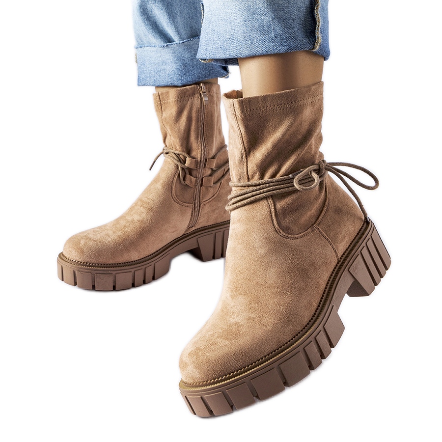 As botas bege averardo da coleção Keeshoes são um modelo universal e elegante do tornozelo, feito de couro ecológico de camurça na sombra de "nude semente". A combinação de uma cor sutil, nariz redondo e encadernação decorativa fornece um efeito clássico e moderno - ideal para muitos estilos.