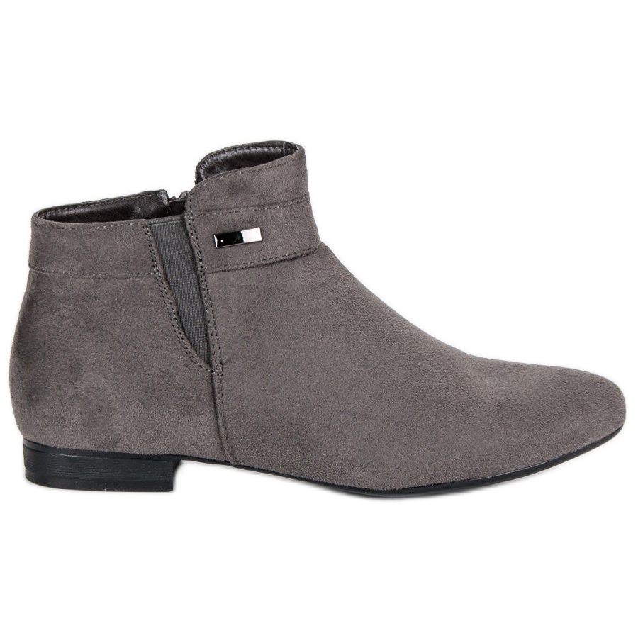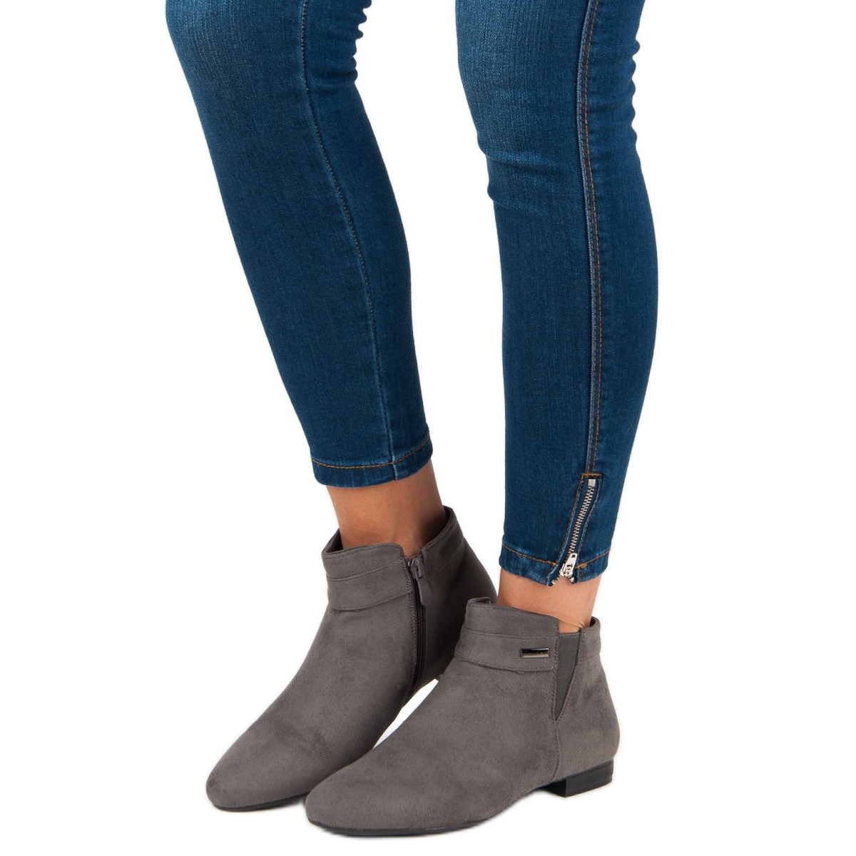 Descubra elegância e conforto em todas as situações com botins rasos cinza da Vinceza. Estes sapatos estilosos, confeccionados em couro camurça ecológico, combinam perfeitamente estética com conforto. Têm bico redondo e salto plano de 2 cm de altura, o que os torna a escolha ideal para o uso diário e ao mesmo tempo confere um charme sutil a qualquer estilo.