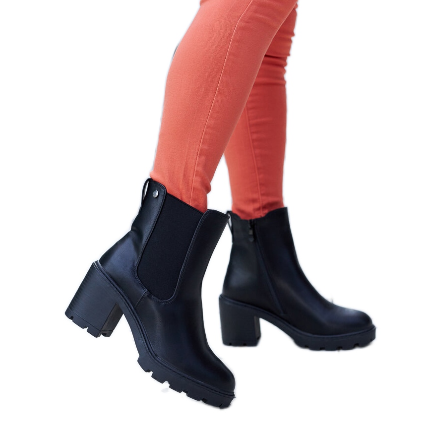 As botas pretas do CAIO são um modelo feminino isolado em um post estável, combinando um corte clássico com materiais modernos. Feito de couro orgânico (PU preto) com uma inserção de tecido quente, eles funcionarão como calçados elegantes e práticos para a temporada de outono -inverno.