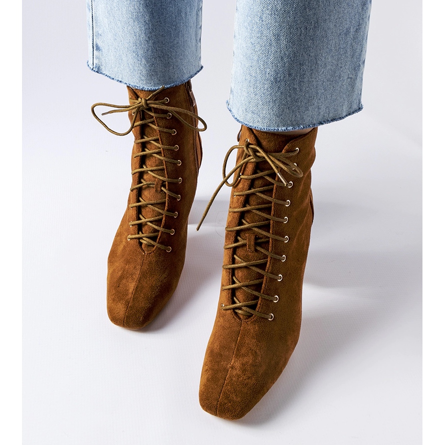 A cor castanha do calçado e o design minimalista sem padrões desnecessários fazem destas botas um complemento intemporal em qualquer guarda-roupa. O laço não só adiciona personalidade, mas também permite que o sapato se ajuste perfeitamente ao pé, e o zíper lateral torna muito mais fácil calçar e tirar o sapato rapidamente. A biqueira quadrada confere às botas um caráter fashion, e o salto bloco de 9 cm de altura é um detalhe elegante que afina visualmente as pernas e garante a estabilização do pé.