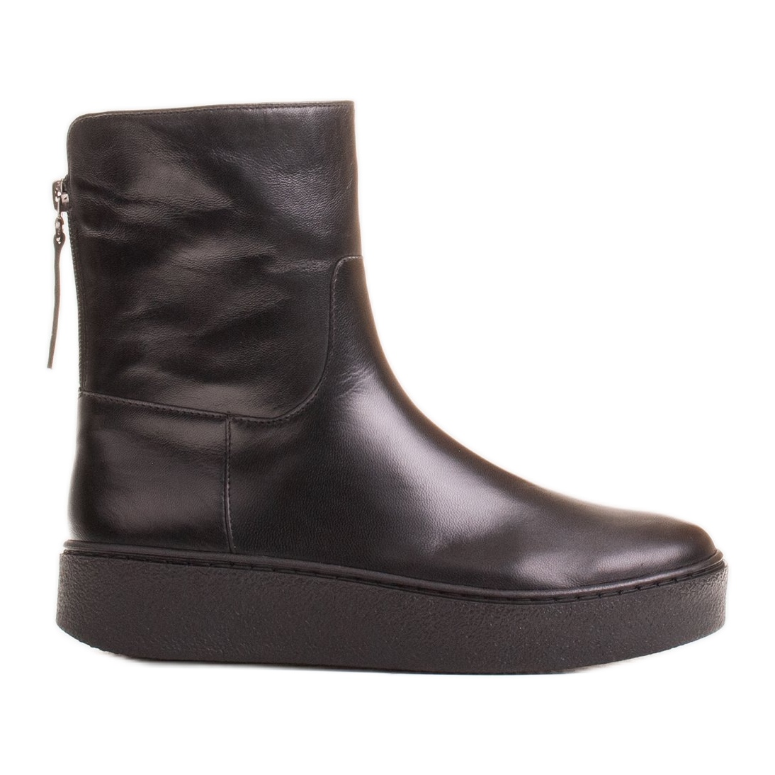 A parte superior em couro granulado natural de alta qualidade garante não só um visual elegante, mas também durabilidade e conforto de uso. O interior das botas tem acabamento em feltro e isolamento, o que as torna perfeitas para os dias mais frios, mantendo os pés aquecidos. A biqueira redonda e a plataforma de 3 cm de altura conferem personalidade e tornam os sapatos confortáveis e elegantes ao mesmo tempo.