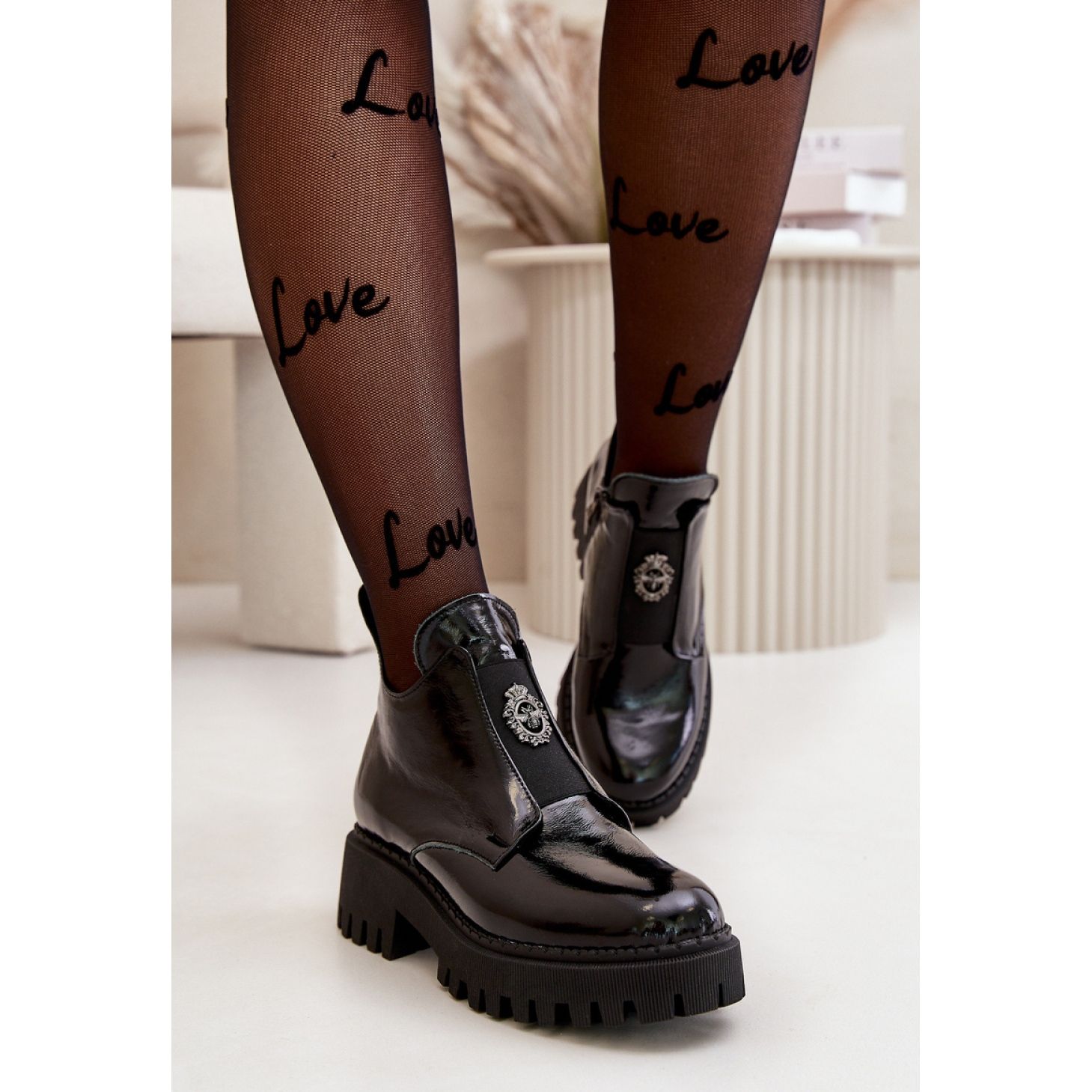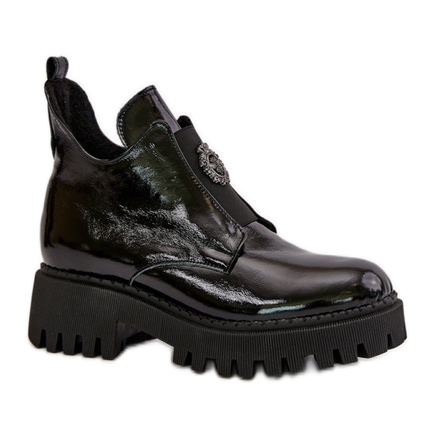 Na frente, na inserção flexível, há uma decoração plástica original, que dá às botas um caractere único. O interior dos sapatos foi isolado com um cobertor de sapatos, o que os torna perfeitos para dias mais frios, proporcionando calor e conforto.