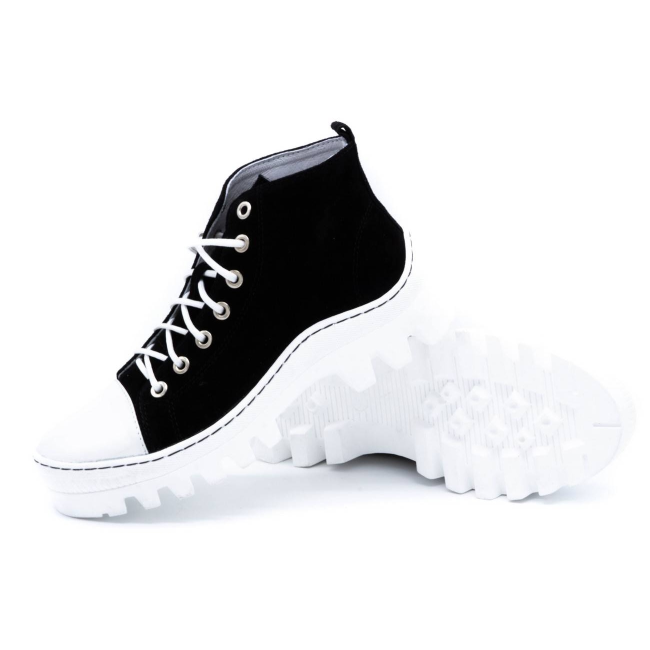 Feito de couro de camurça natural de alta qualidade em um tom de preto "preto (pérola preta)", com uma sola branca contrastante. O interior e a inserção também do couro natural, o que garante conforto e boa respirabilidade do pé. Uma plataforma estável com uma altura de 4 cm e uma alta alta, alcançando em frente ao conforto do tornozelo (9 cm) durante caminhadas mais longas e adiciona uma altura sutil. As botas têm um nariz redondo e um laço clássico, graças ao qual você pode combiná -las facilmente ao seu pé. Sem isolamento - Perfeito para dias temporários e mais frios sem geada.