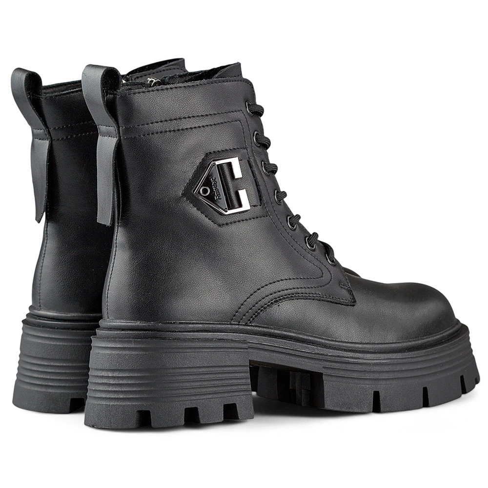 Detalhes: Botins femininos de couro preto na plataforma, botas com isolamento de couro natural
