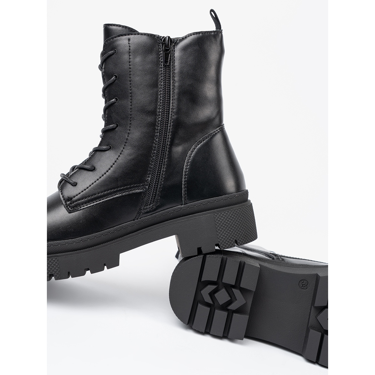 Um fixador de zíper conveniente e detalhes atados são uma solução prática que permite que você use rapidamente e combine os sapatos na perna. O interior das botas foi conquistado com um tecido agradável, o que aumenta o conforto do uso, e sua altura atingindo o tornozelo acrescenta elegância à figura.
