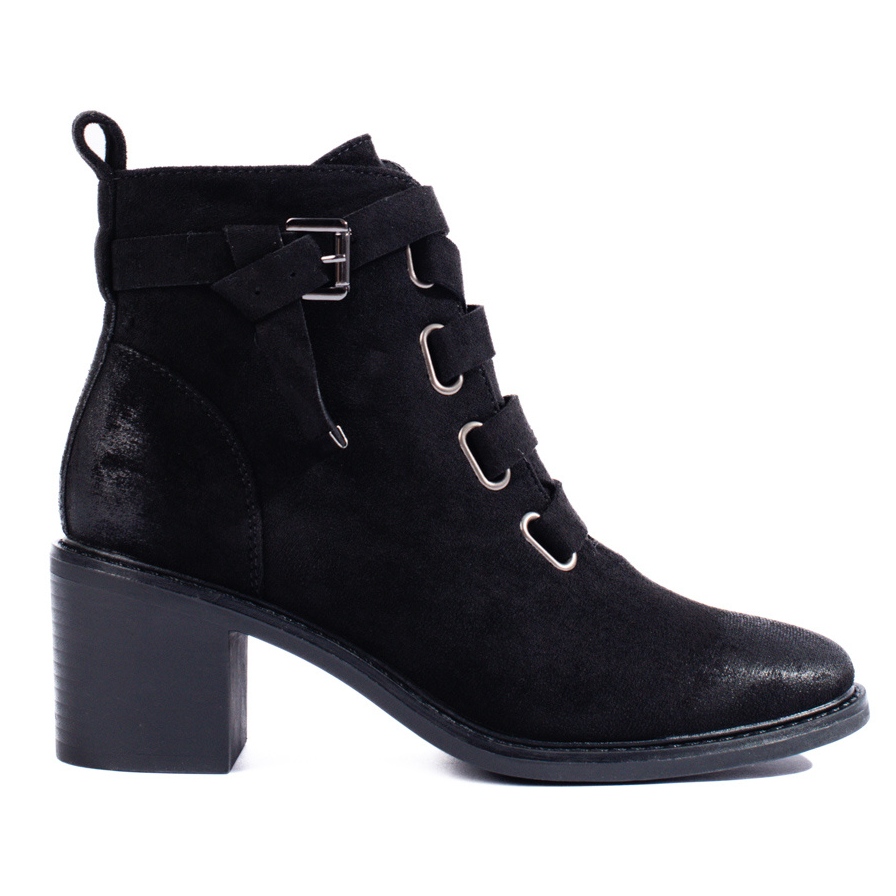 Classic, e ao mesmo tempo com uma botas pretas de garra no poste, é essencial para a temporada de outono/inverno. Feito de camurça ecológica suave, com isolamento e "cobertor de calçados", eles oferecem conforto térmico durante os dias mais frios. Um post estável de 6 cm de altura adiciona uma aparência feminina, não cansando os pés.