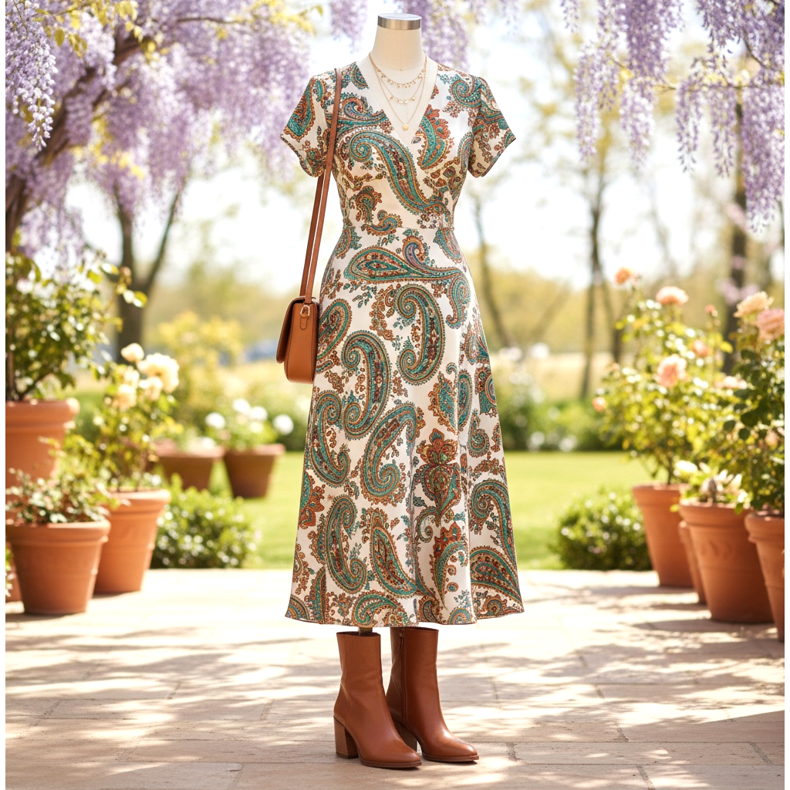 Um vestido midi feito de viscose ou seda com estampa paisley ou floral combinado com botins marrons de salto alto é o look perfeito para um casamento na primavera ou o aniversário de um ente querido. Adicione uma bolsa tiracolo de couro bege e um colar delicado - o efeito está pronto.
