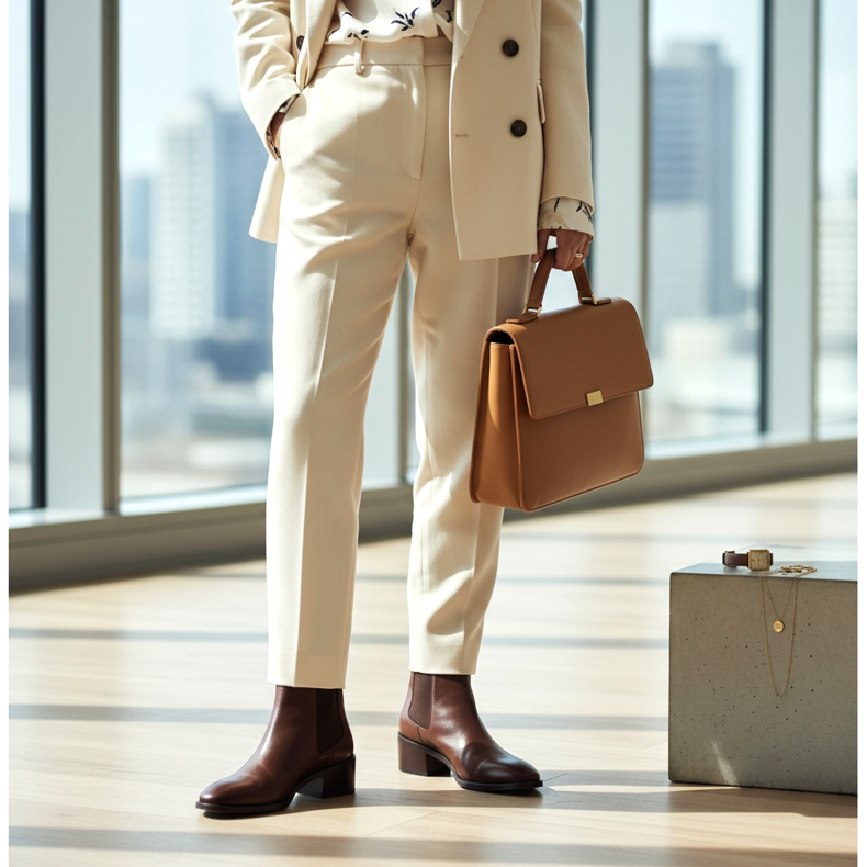 Um terno nas cores creme, bege ou pastel combinado com botas Chelsea marrons é um dos looks mais fortes do vestuário masculino e feminino em 2026. O marrom combinado com um terno claro - em vez de sapatos pretos - cria uma combinação mais viril e suave.