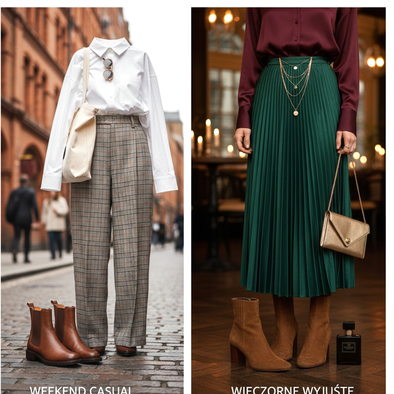 Fim de semana casual: Calças largas xadrez (as chamadas calças xadrez) combinadas com uma camiseta branca ou uma camisa oxford simples e botas Chelsea marrons - este é um look inspirado nas ruas da moda de Londres, que funciona igualmente bem para compras de fim de semana e para um café com amigos. Uma bolsa longa de couro ou de lona são o acessório perfeito.