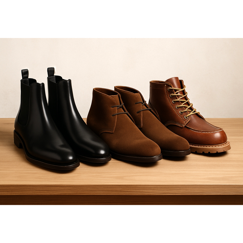 Semelhante ao Chukka, mas geralmente feito de couro camurça macio e com sola de borracha crepe. Mais leve e casual. Modelo icônico: Clarks Desert Boot.