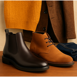 As botas Chukka e Chelsea em tons marrons combinam perfeitamente com calças em bege, oliva ou azul marinho. Esta combinação é um clássico smart casual.
