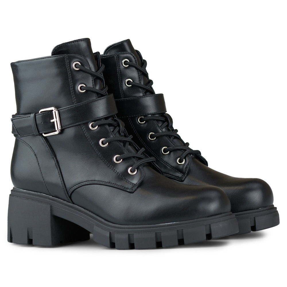 Detalhes: Botins pretos com cadarço feitos de couro ecológico e salto baixo