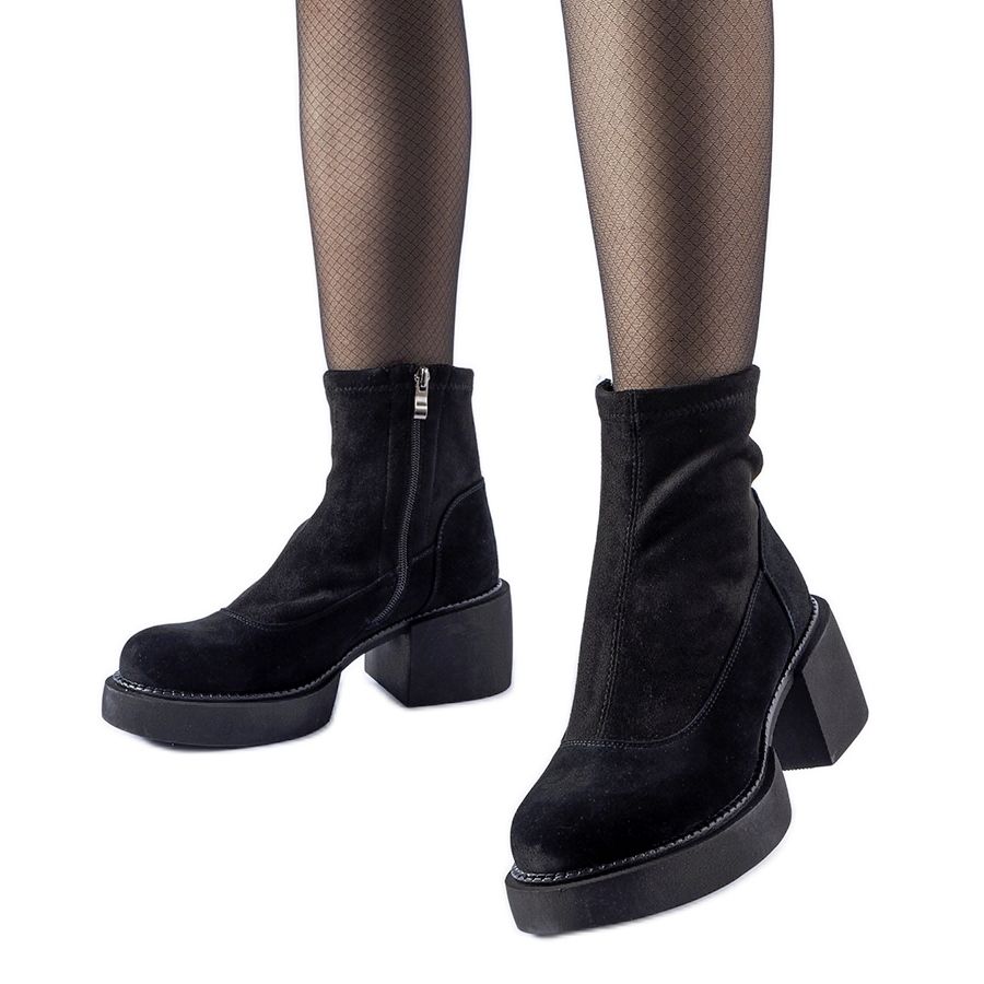 Botas elegantes, confortáveis e pretas quentes que buscam o tornozelo são a estação obrigatória da vida útil do outono. Feito de couro ecológico de camurça, por dentro, em um bloco estável de 6,5 cm. Perfeito para estilizações cotidianas e mais elegantes.