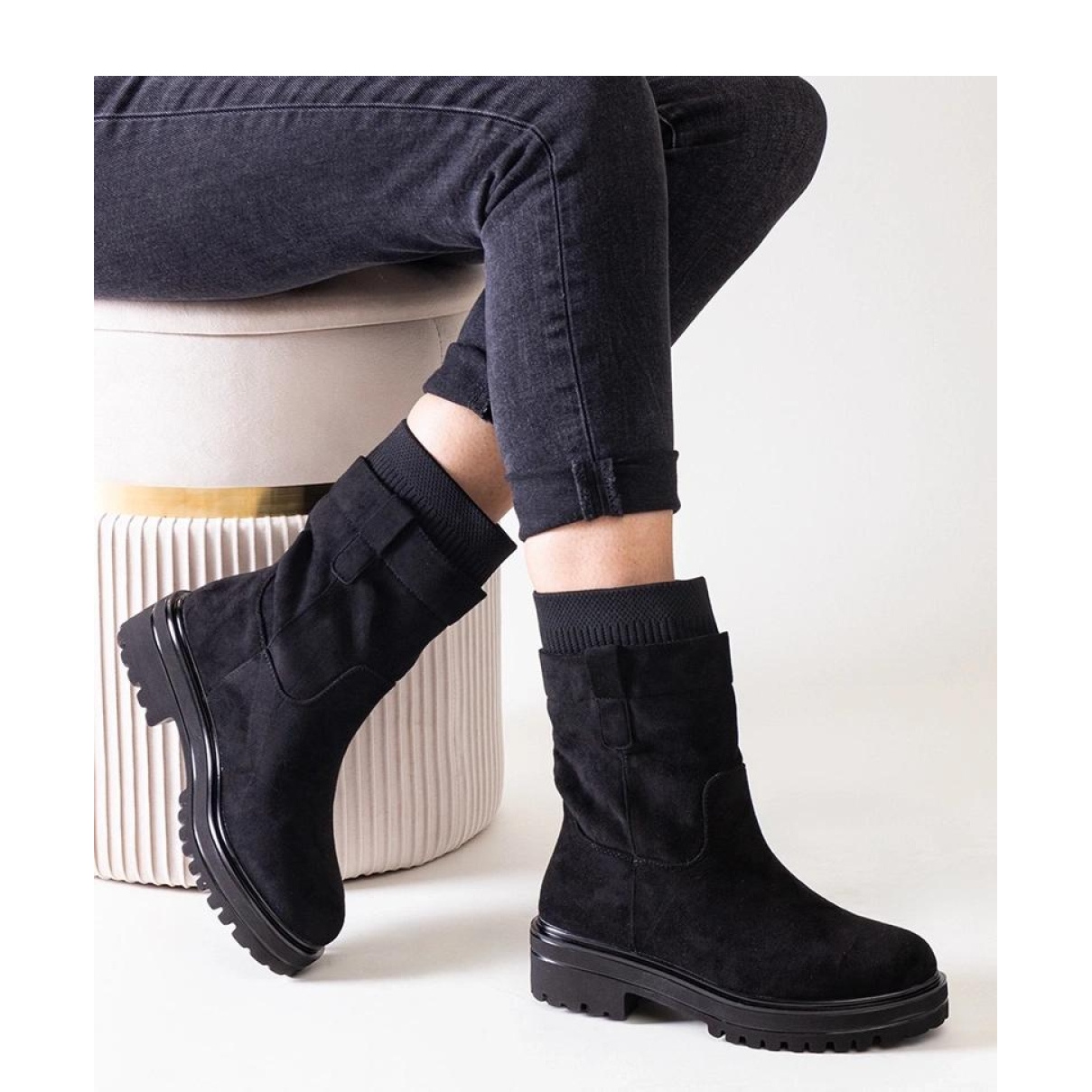 Botas pretas conectadas com uma meia é um must-have em todos os guarda-roupas da moda. Esses sapatos elegantes combinam design moderno com o máximo conforto, o que os torna a escolha perfeita para dias frios. A altura do tornozelo não apenas protege os pés do frio, mas também adiciona um sotaque elegante a qualquer estilização.