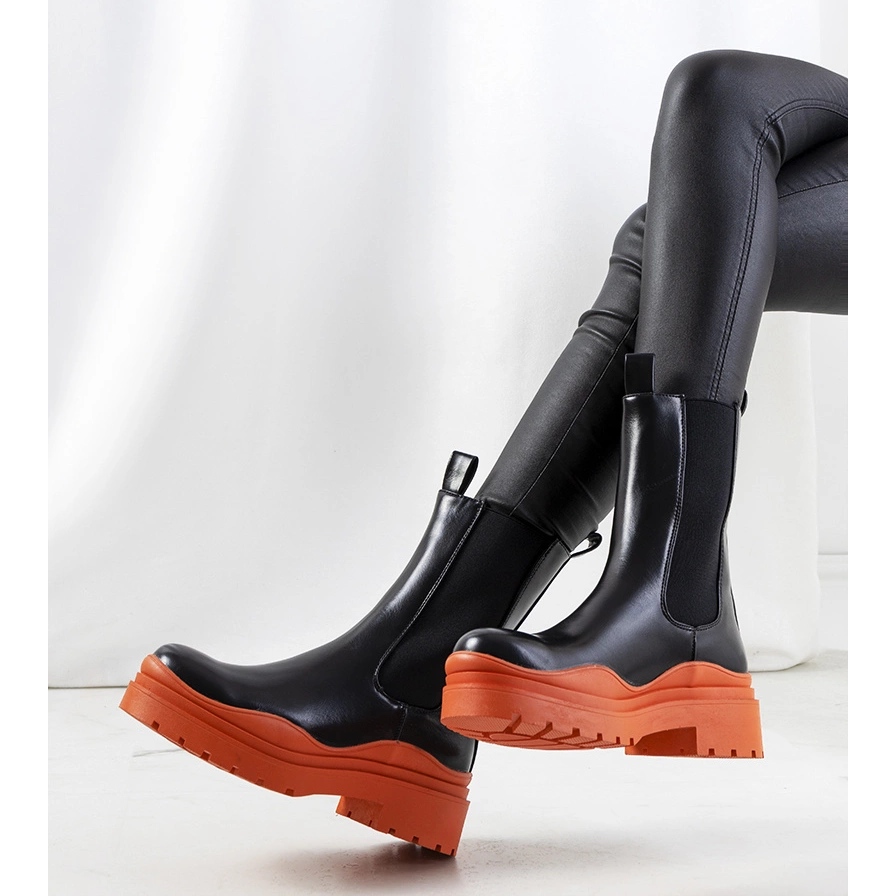 Botas pretas Nester com um solo laranja-um sotaque corajoso no outono e guarda-roupa de inverno