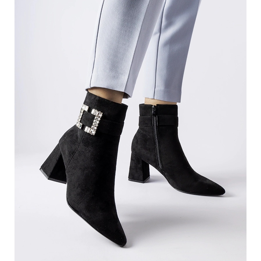 Botas pretas em um post com alfero zircões - elegância e calor nos dias mais frios. Botas elegantes e isoladas feitas de couro ecológico de camurça, que combinam o chique feminino com o conforto diário. Uma decoração delicada e pontuda do nariz e do zircão dá a eles um personagem único, graças ao qual eles são ótimos para estilizações diárias e mais elegantes.