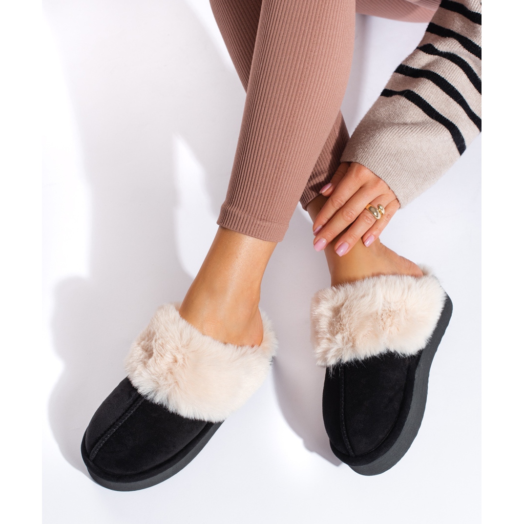 O salto aberto e sem biqueira são uma solução que facilita a colocação e a retirada do pé, o que é especialmente apreciado no caso do calçado doméstico. Os chinelos SHELOVET estão disponíveis na cor preta universal, o que os faz combinar com a maioria dos estilos de casa.