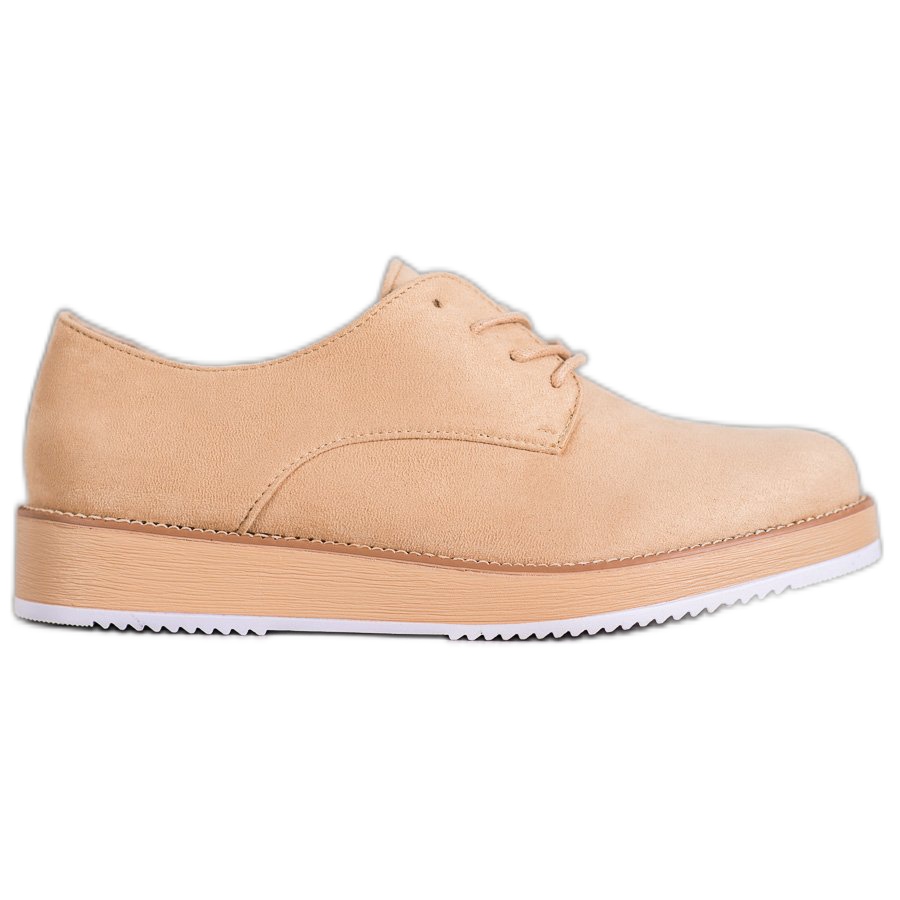 Fabricados com materiais de alta qualidade, estes sapatos castanhos claros são duráveis, garantindo uma utilização duradoura, mesmo quando usados de forma intensiva. A camada externa do calçado é confeccionada em couro camurça ecológico, enquanto o interior é forrado em couro ecológico, o que garante conforto e prazer de usar o dia todo.