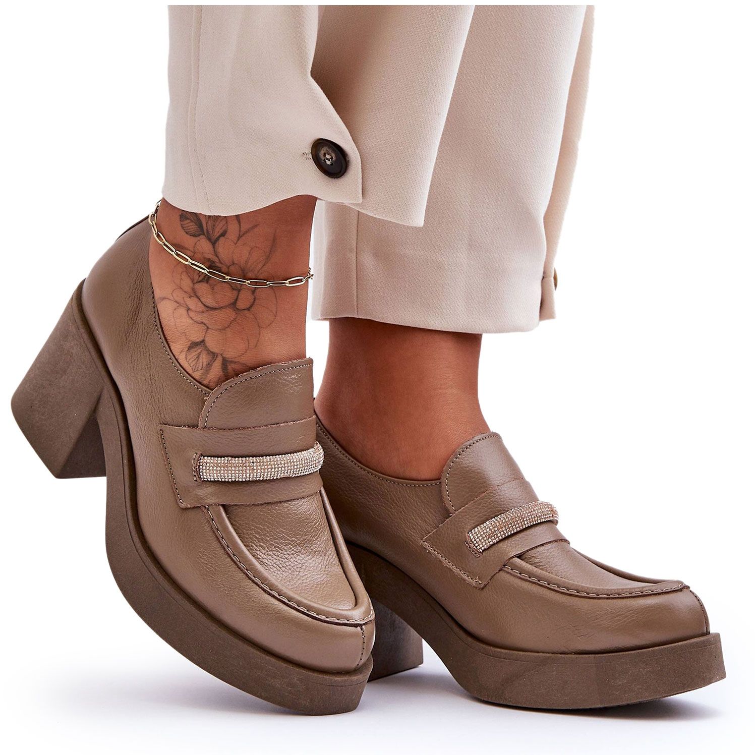 Sapatos de lemar femininos elegantes e confortáveis, feitos de couro natural - perfeito para a temporada de outono/inverno. O nariz clássico e arredondado e um pilar largo com uma altura de 7,5 cm garantem estabilidade e conforto a cada passo, e um delicado ornamento e prisioneiros brilhantes dão aos sapatos um personagem elegante.
