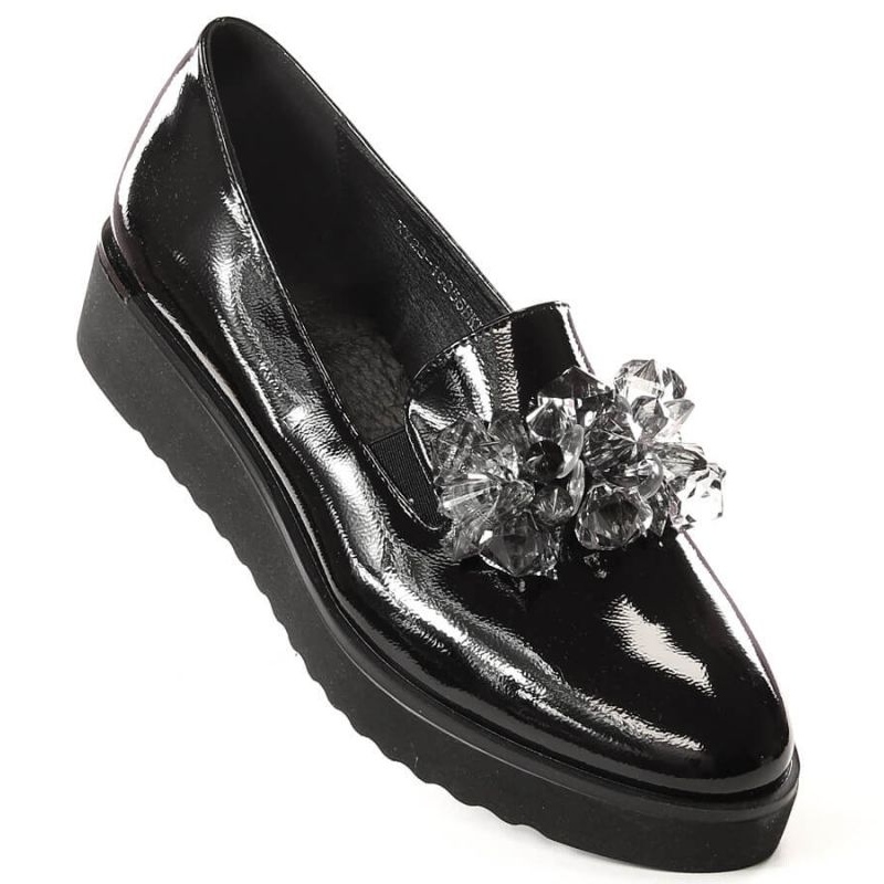 Os sapatos pretos e brilhantes de couro envernizado de Vinceza certamente chamam a atenção. Um elemento adicional que os diferencia dos demais são os cristais sutilmente colocados que conferem nobreza e brilho aos sapatos. É um toque elegante que combina perfeitamente tanto com jeans quanto com calças ou saia mais formais.