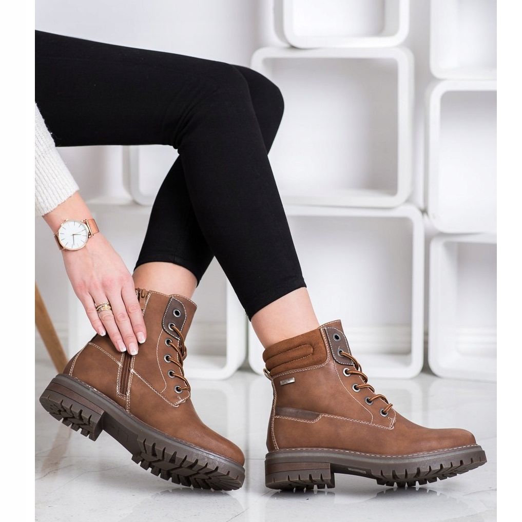 As botas foram desenhadas pensando na praticidade - o salto é fechado e rígido, e o fechamento por cadarço permite um ajuste perfeito ao pé. A cor castanha dominante e o design minimalista sem motivos fazem com que estes sapatos combinem perfeitamente com vários looks.