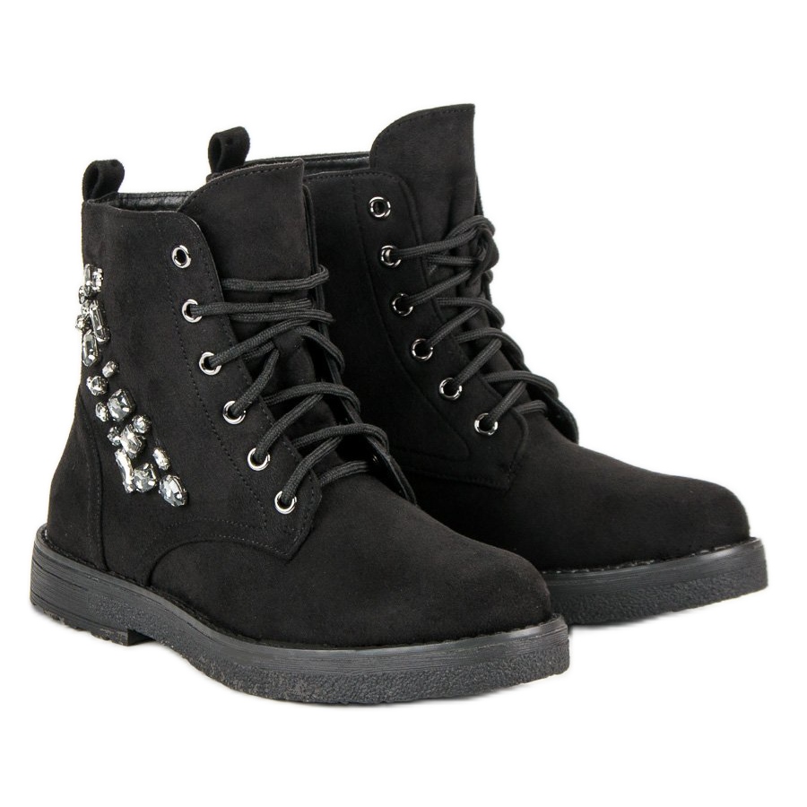 Um bico redondo e bem torneado e um salto plano de 3 cm de altura garantem o máximo conforto, e o laço e o zíper elegantes permitem fácil colocação e retirada. Os strass na parte superior dão um toque de moda, tornando estas botas um verdadeiro atrativo.