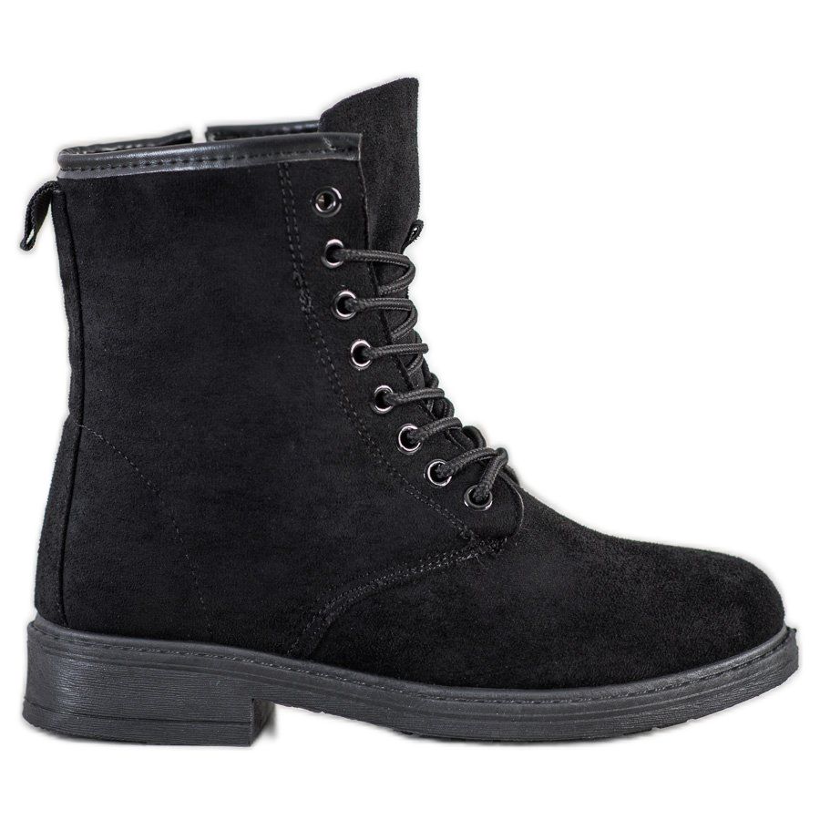 Confeccionadas em couro camurça ecológico, as botas são estéticas e ecologicamente corretas. A sua cor preta faz com que combinem com muitos looks diferentes, e a biqueira redonda confere-lhes um carácter ligeiramente casual. O interior do calçado é preenchido com tecido macio, o que garante conforto de uso, e o isolamento permite um uso confortável nos dias mais frios.