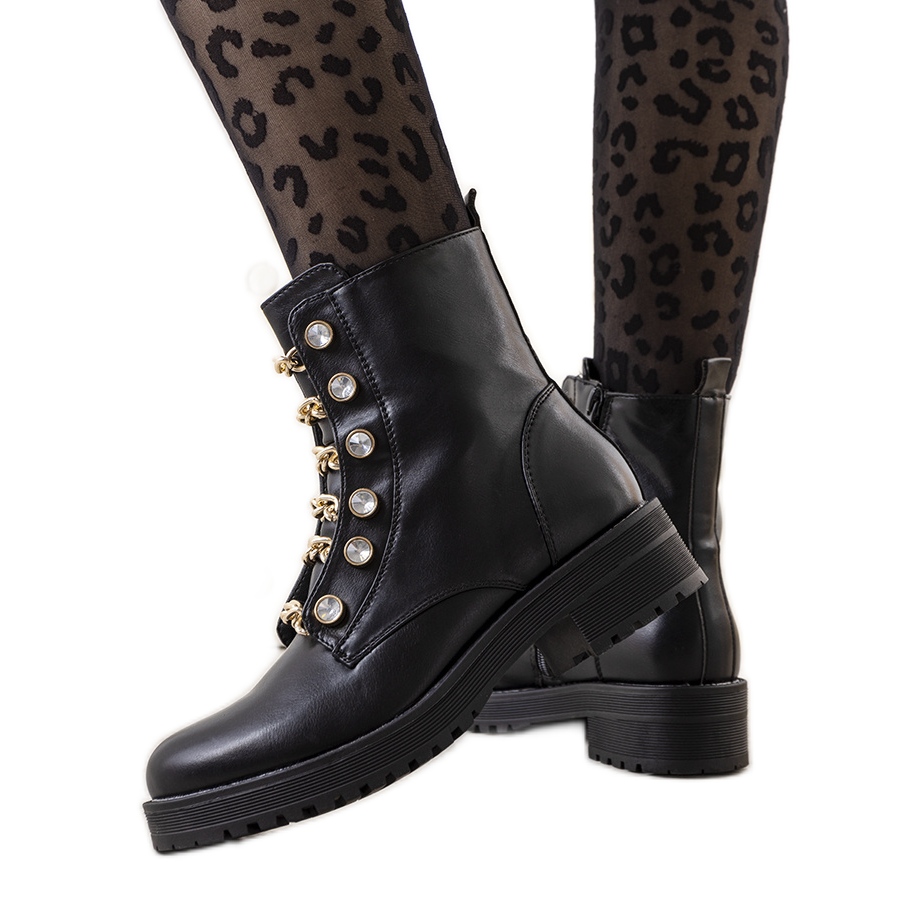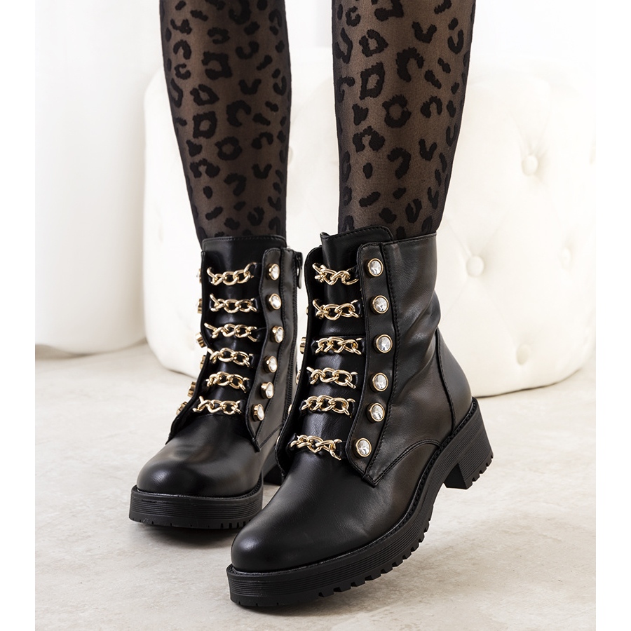 Descubra o último modelo de armadilhas Curiel da marca PA1 - a escolha perfeita para todas as mulheres elegantes! Estas elegantes botas pretas combinam estilo e conforto, o que as torna um elemento indispensável do seu guarda-roupa de outono. Uma corrente de ouro imitando rendas e strass sutis conferem-lhes um caráter único que certamente chamará a atenção.