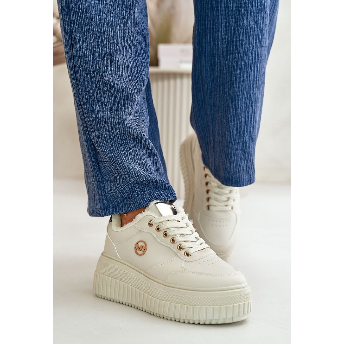 Uma plataforma enorme com uma altura de 6 cm eleva impressionantemente a figura, acrescentando sua leveza e caráter e, ao mesmo tempo, garante excelente estabilidade ao caminhar. Graças ao isolamento de peles, esses sapatos são uma ótima opção para dias mais frios, proporcionando conforto e calor.