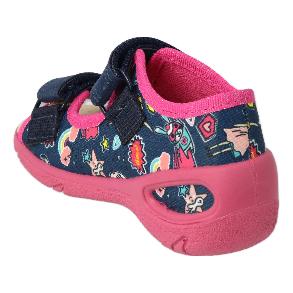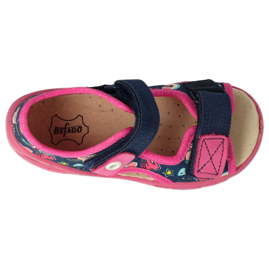 As sandálias infantis Befado PU 065P172 são a escolha perfeita para cada pequena fashionista. Estes sapatos coloridos em tons de azul marinho e rosa combinam conforto e design moderno, o que os faz combinar perfeitamente com vários estilos de verão.