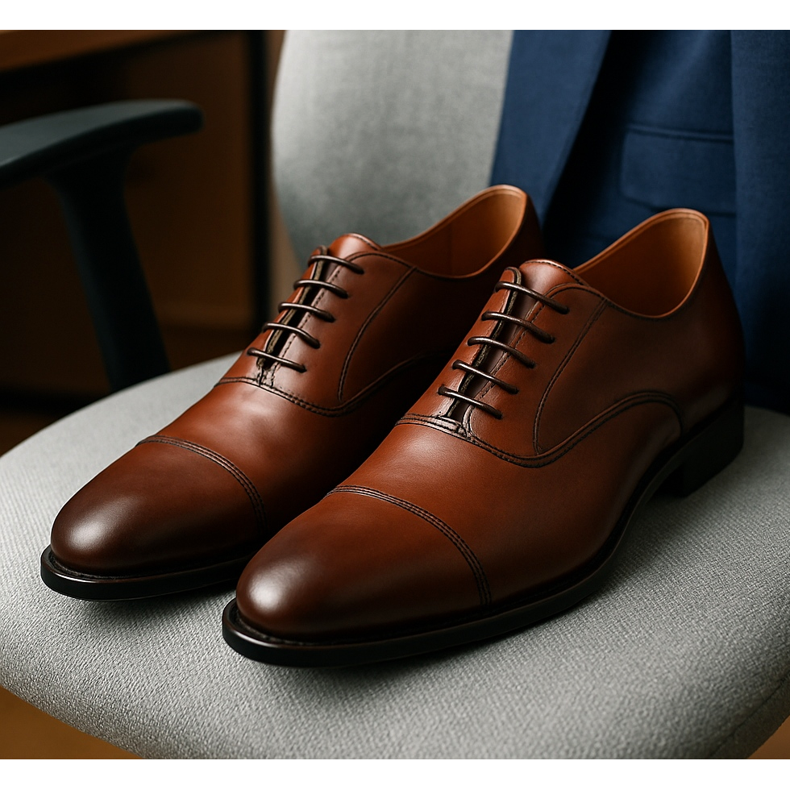 O couro natural é a melhor escolha para o escritório. Respira, adapta-se ao pé e ganha carácter com a idade. Evite materiais sintéticos - eles não fornecem ventilação adequada e podem fazer com que seus pés suem excessivamente.