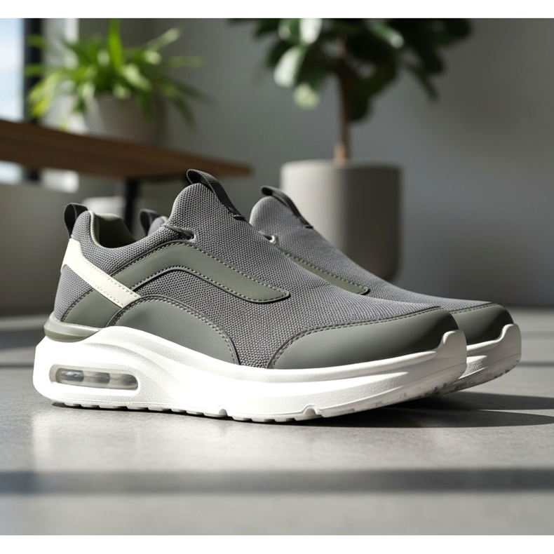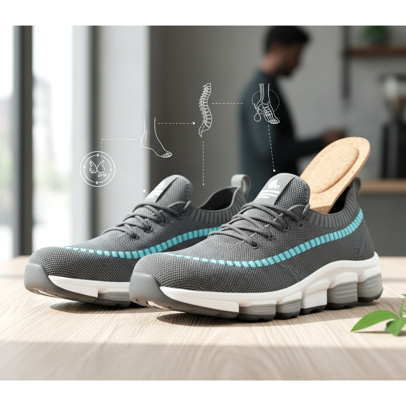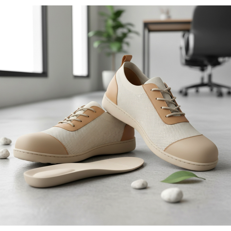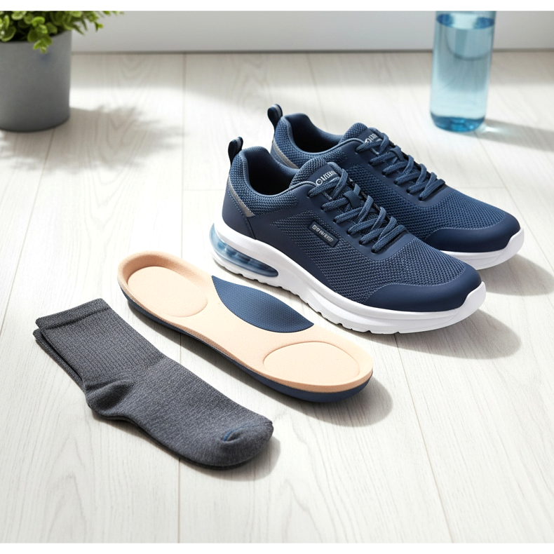 Em primeiro lugar: depreciação. Os sapatos devem ter uma sola grossa e flexível que absorva choques ao caminhar e pisar em superfícies duras (por exemplo, azulejos). Tênis rasos com sola fina são a pior escolha. Procure modelos com espuma EVA ou sistemas de ar na sola. Uma pequena cunha ou salto (aprox. 2-3 cm) é mais saudável do que um sapato completamente plano porque alivia o tendão de Aquiles.