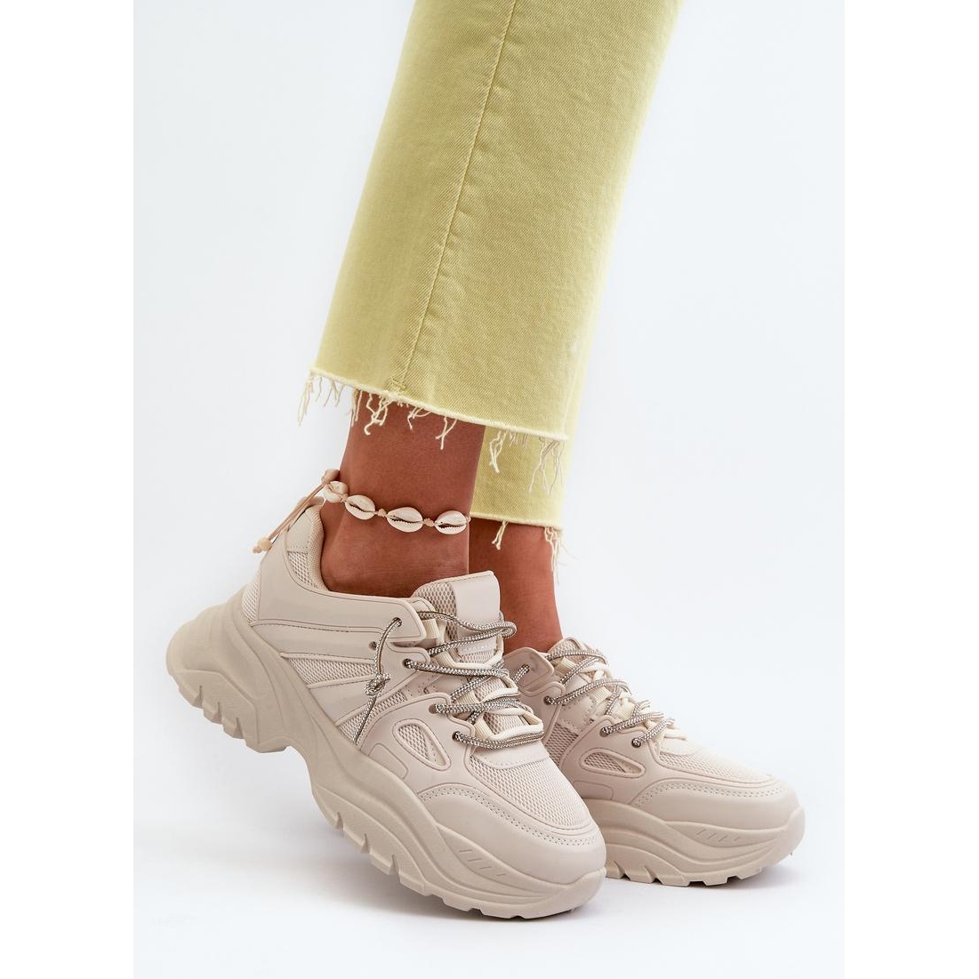 Descubra um estilo único e um conforto excepcional com nossos sapatos esportivos em uma enorme plataforma em cores bege! Esses tênis são a combinação perfeita de design e conforto da moda, que certamente chamarão a atenção. Graças ao laço decorativo, os sapatos ganham um personagem original, e a inserção de espuma suave garante conforto o dia todo.