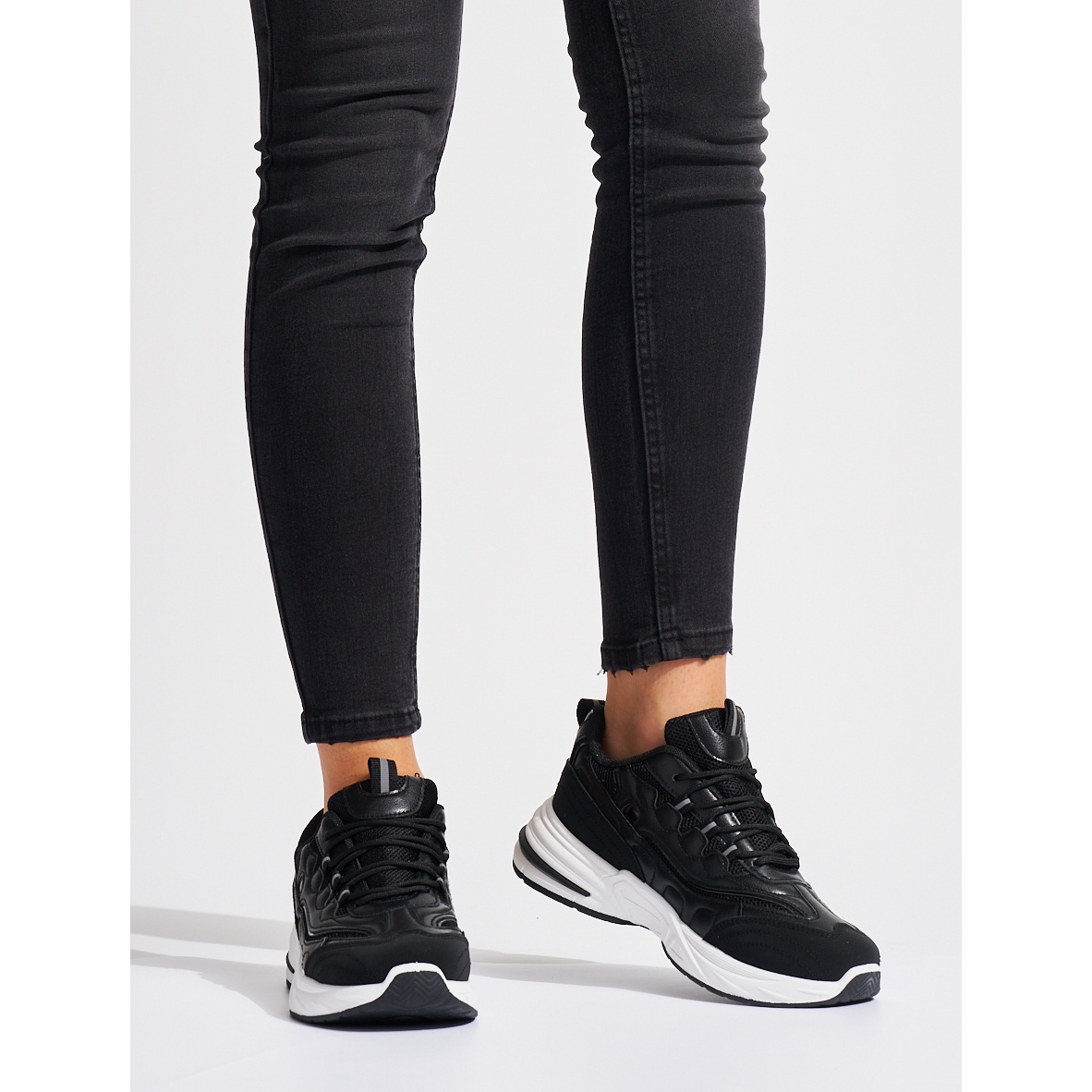 Detalhes: Calçados esportivos femininos pretos com sola grossa