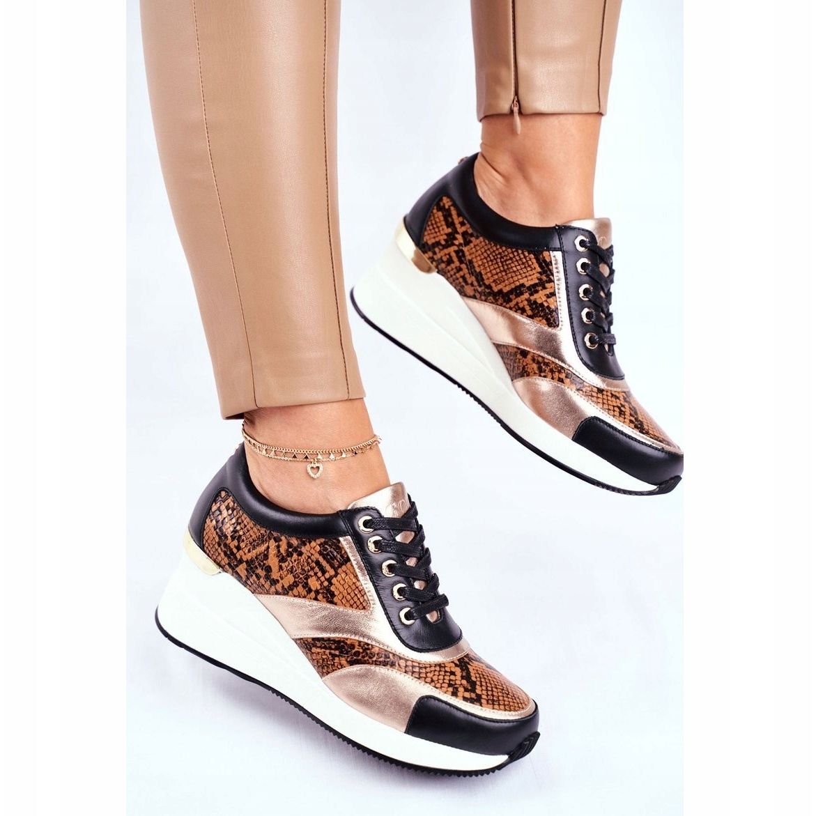 Tênis elegantes e confortáveis de Goe, feitos de couro natural, que combinam um personagem esportivo com uma nota de estilo feminina. O modelo é distinguido por um motivo de animal sutil e uma colheita delicada com uma altura de 6,5 cm, que discretamente alonga a figura, sem desistir do conforto do uso diário.