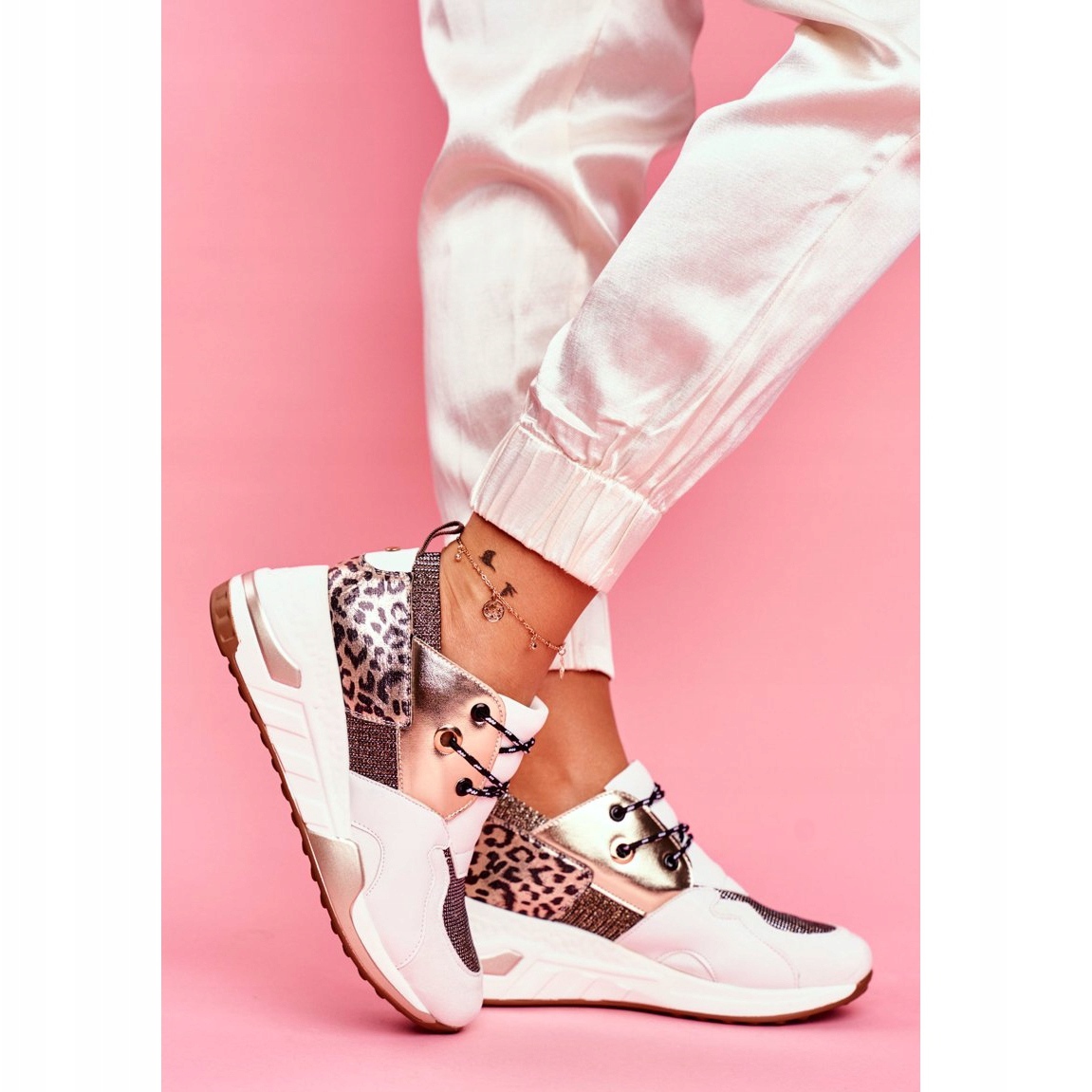 O material incomum com estampa de leopardo e o brilho atraente fazem com que esses tênis se destaquem dos demais. Além disso, a biqueira de camurça acrescenta personalidade a eles, e a combinação de branco, dourado, amarelo e outras cores faz com que combinem com muitos looks.