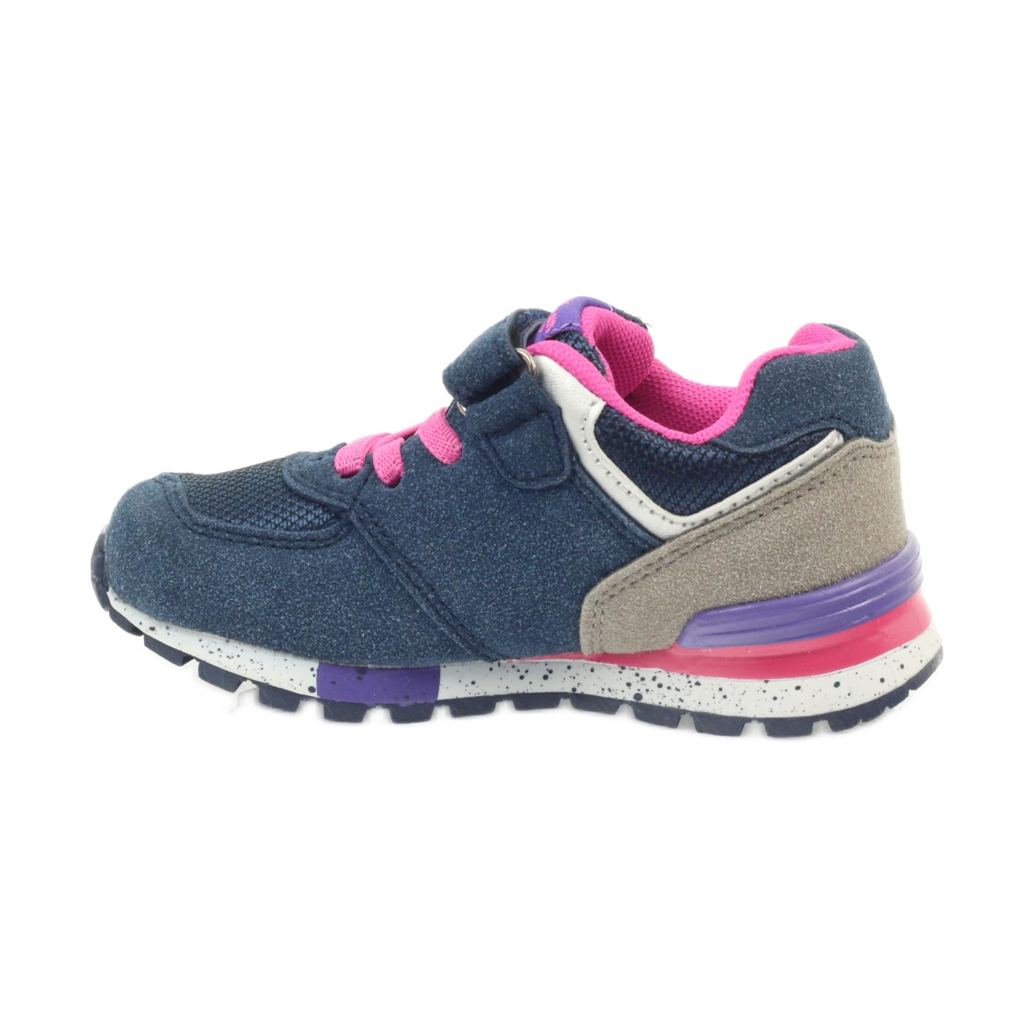 Cores interessantes - azul marinho com acessórios rosa - certamente agradarão a todos os pequenos fashionistas. Uma vantagem adicional é o fácil fecho de velcro, que permite aos mais novos calçar e tirar os sapatos rapidamente, eliminando a frustração associada ao atar os atacadores.
